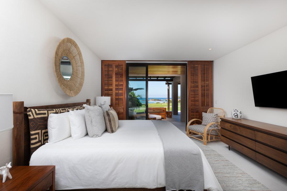 - Bedroom 1: King bed, en suite bathroom with indoor and outdoor shower, outdoor terrace with ocean view, TV