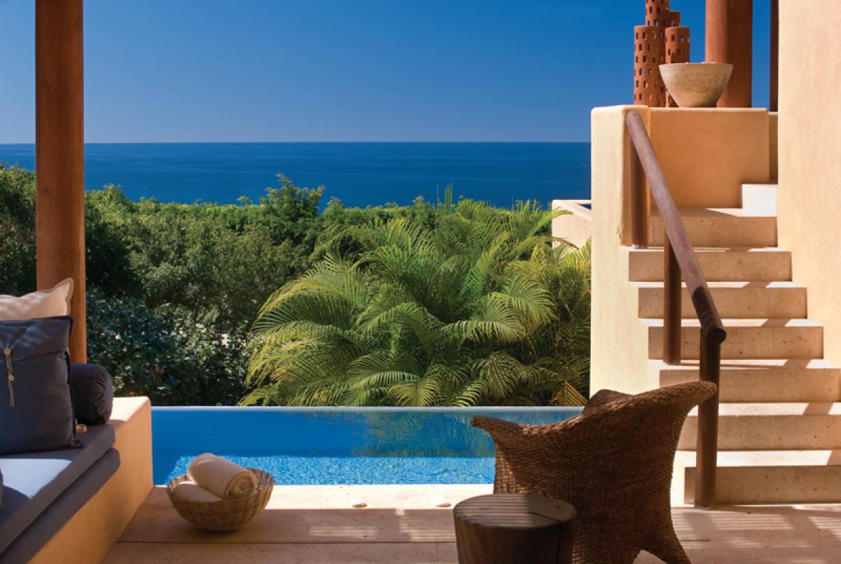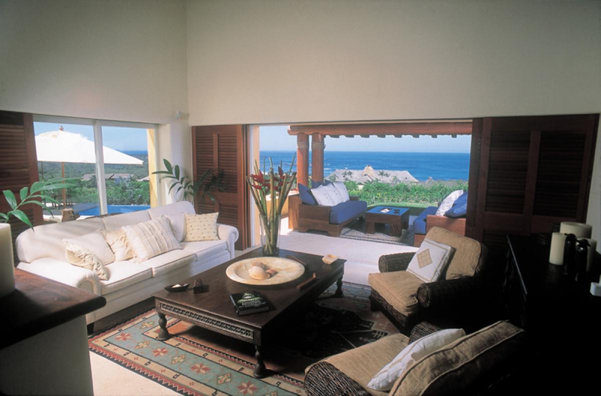 You will feel at home in this fabulous Ocean View Villa, located oceanfront at the Four Seasons in the Punta Mita resort, with breathtaking views of the Pacific Ocean. This unique Ocean View Villa rental is decorated and furnished with a Mexican contemporary style. Like all traditional, antique Mexican homes, the patio entrance surrounds a marble stone fountain; in that same tradition, the patio grants access to all bedrooms and to the common guest living room and terrace areas. The private and spacious terraces at Ocean View Villa feature an infinity pool and a jacuzzi overlooking the Pacific Ocean, and an outside dining and sitting area with a grill where guests can enjoy the marvelous views and spellbinding sunsets. Two of the bedrooms, as well as all the common guest areas, have awesome oceanviews. The kitchen in this Punta Mita villa is fully equipped with top of the line cooking facilities. Meals may be enjoyed in the dining room, comfortable enough to sit eight people. A family room adds to the sensation of total relaxation due to its exquisite decoration, comfortable furniture, CD and DVD players, and plasma screen TV's in all its five rooms. The spacious bathrooms are state of the art, with rain shower heads, independent soak in bathtubs, and marble double basins for comfort and luxury in an ambiance of privacy and Four Seasons pampering. The villa has 3 bedrooms with king size beds and 2 with 2 double beds.