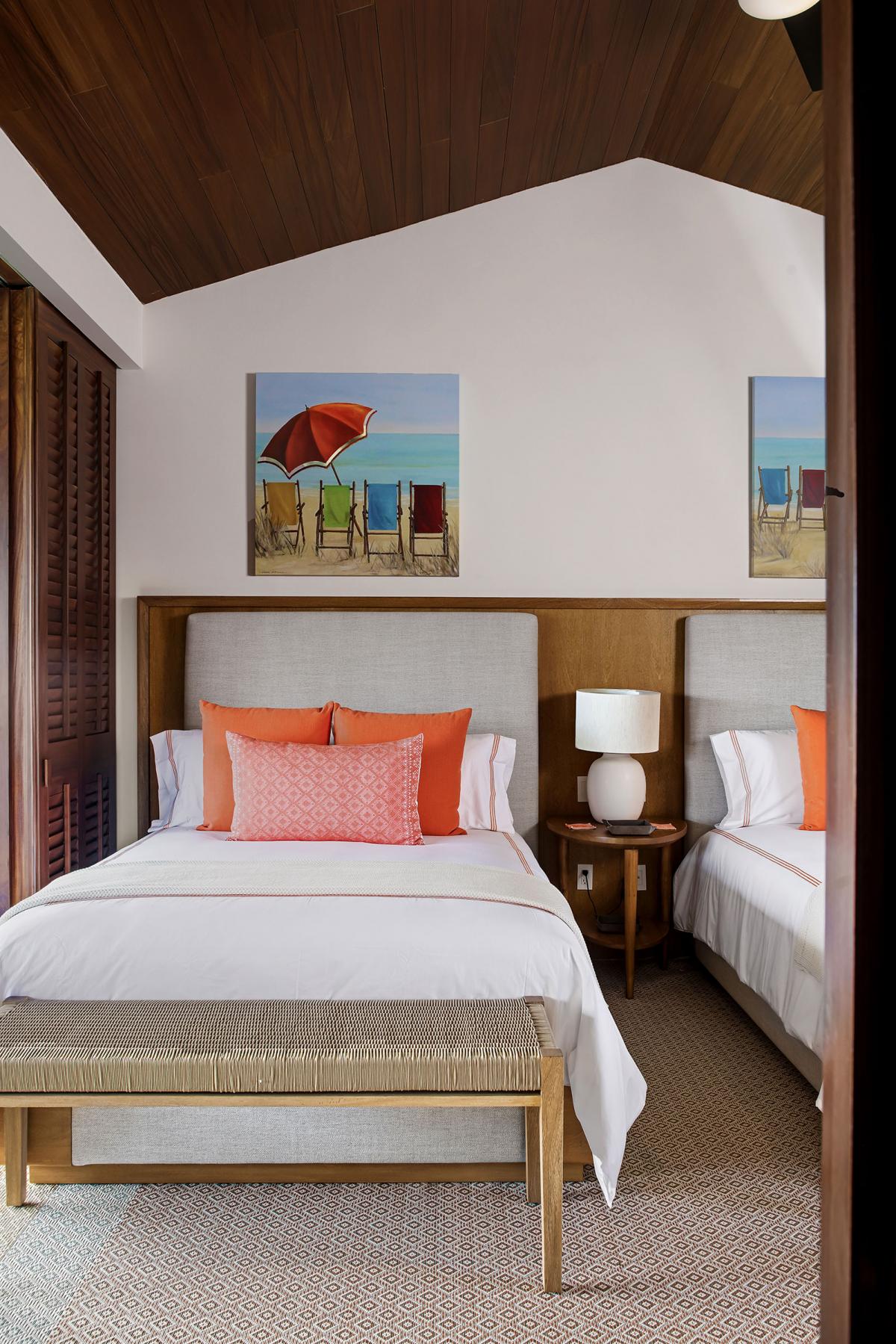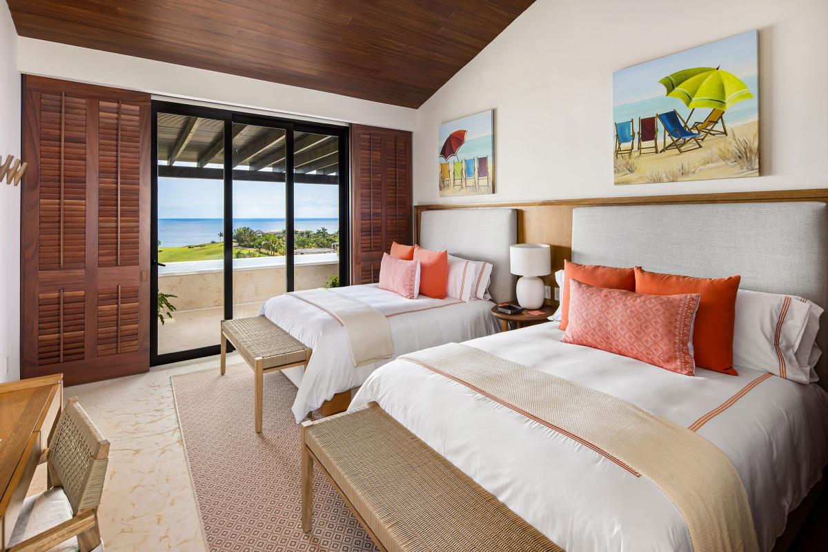 Bedroom 2: This room is equipped with two queen-sized beds, a TV, access to a patio with an ocean view, air conditioning, and an ensuite bathroom with a bathtub and shower.