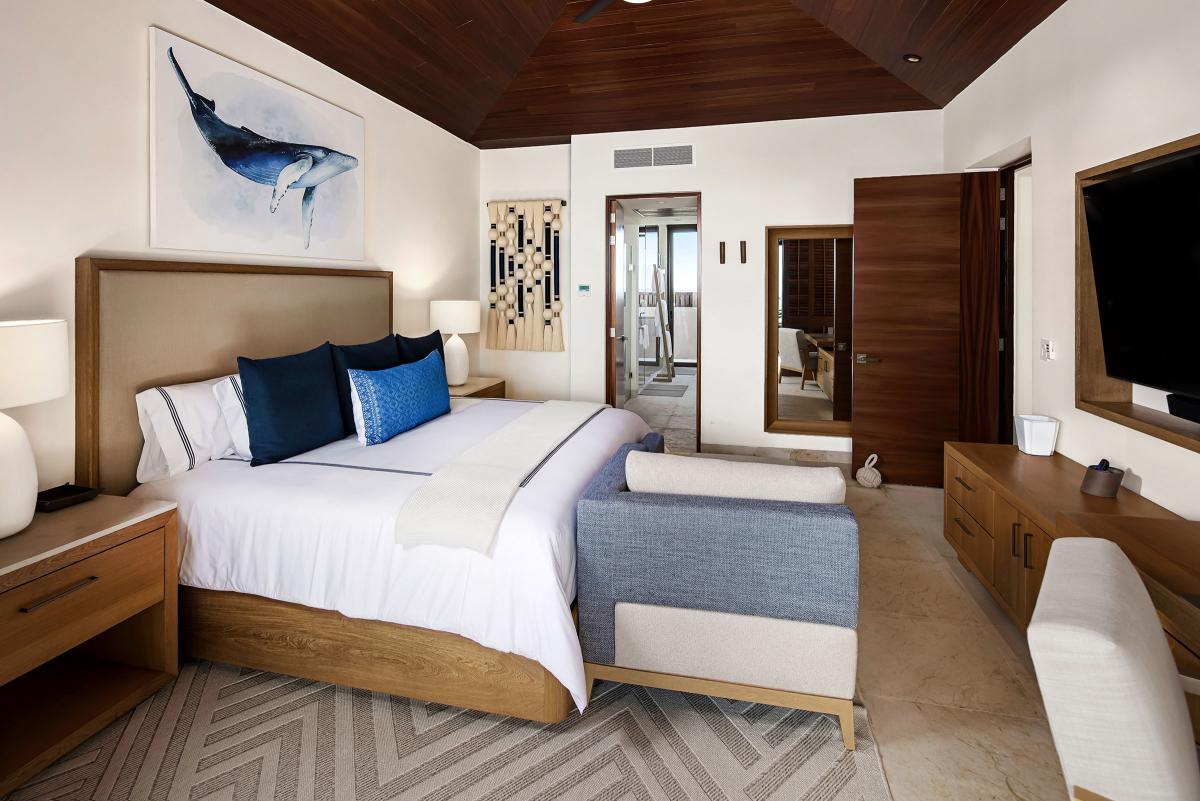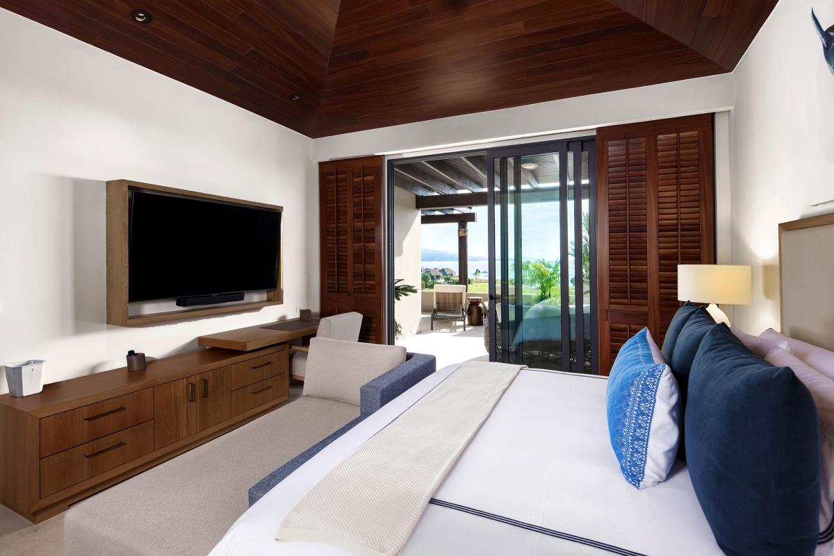 Bedroom 4: This room is equipped with a king-sized bed, a TV, access to a private patio with an ocean view, air conditioning, and an ensuite bathroom with a bathtub, indoor rain shower, and an outdoor shower.