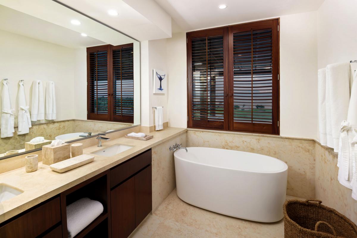Primary Bedroom: This room is equipped with a king-sized bed, a TV, access to a private patio with an ocean view, air conditioning, and an ensuite bathroom with an indoor rain shower and an outdoor shower.