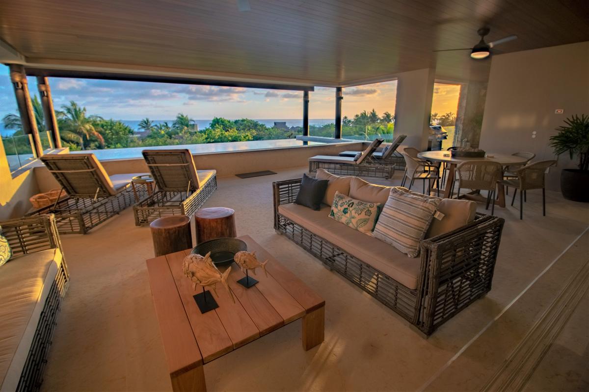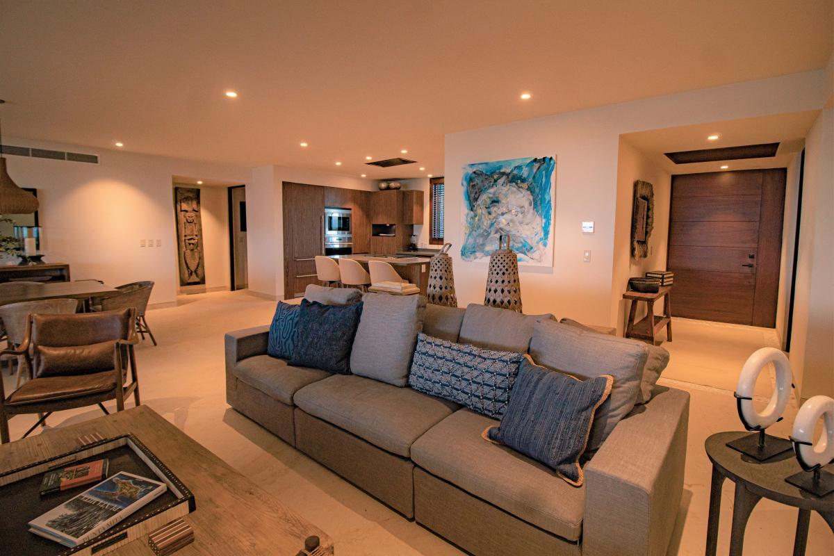 With an expansive layout of approximately 3,466 square feet, Tau 211 stands out as one of the more spacious condominium options. The design reflects an effortless blend of comfort and elegance, embodying the easygoing luxury that defines life in Punta Mita. Set within the esteemed TAU Residences—named after the Huichol word for "sun"—this home pays tribute to its natural surroundings through thoughtful design details. Organic textures, soft coastal accents, and a calm, neutral color scheme set the tone for a truly relaxing retreat. The open-concept interior flows seamlessly into an expansive terrace that features a grill, lounge seating, and a generously sized private infinity pool. Whether you're lounging poolside with a chilled drink or watching the sun dip below the horizon, the rhythmic sound of waves nearby brings a deep sense of peace to every moment.
