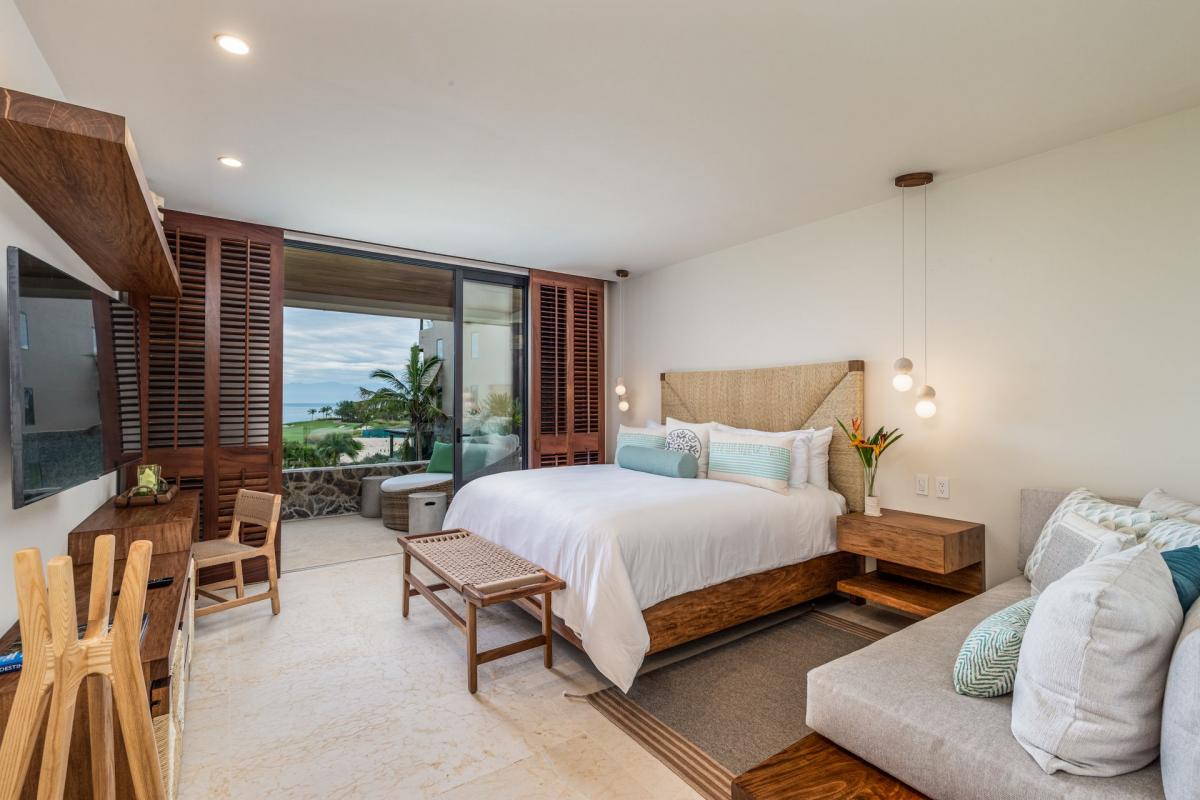 Bedroom: 1 King bed, TV, AC, double closet, balcony with pool and ocean view, outdoor furnishings, ensuite bathroom with double vanity, indoor shower, and bathtub.