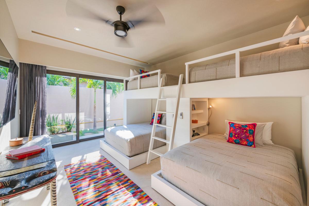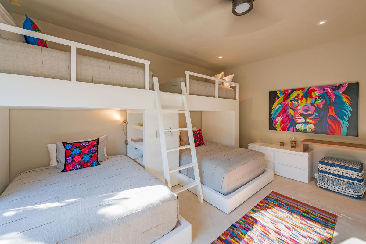 Bedroom 5: This room has two queen and two twin beds (bunkbeds), an ensuite bathroom (shower), and air-conditioning.