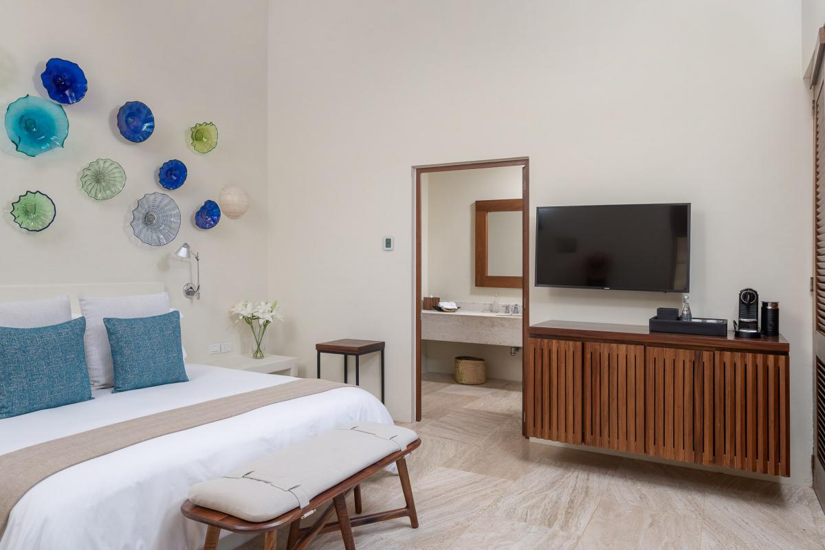 Bugambilias Suite 1: This spacious partial ocean view suite offers two full-size beds, a television and Apple TV, personal security safe, an in-room minibar, a Nespresso® Coffee maker, and an ensuite bathroom with shower. The private patio offers a seating area and an outdoor shower. This suite can convert into One King Size and One Full-Size Bed or a double-size king bed with custom bed linens and is an excellent room to accommodate several younger guests.
