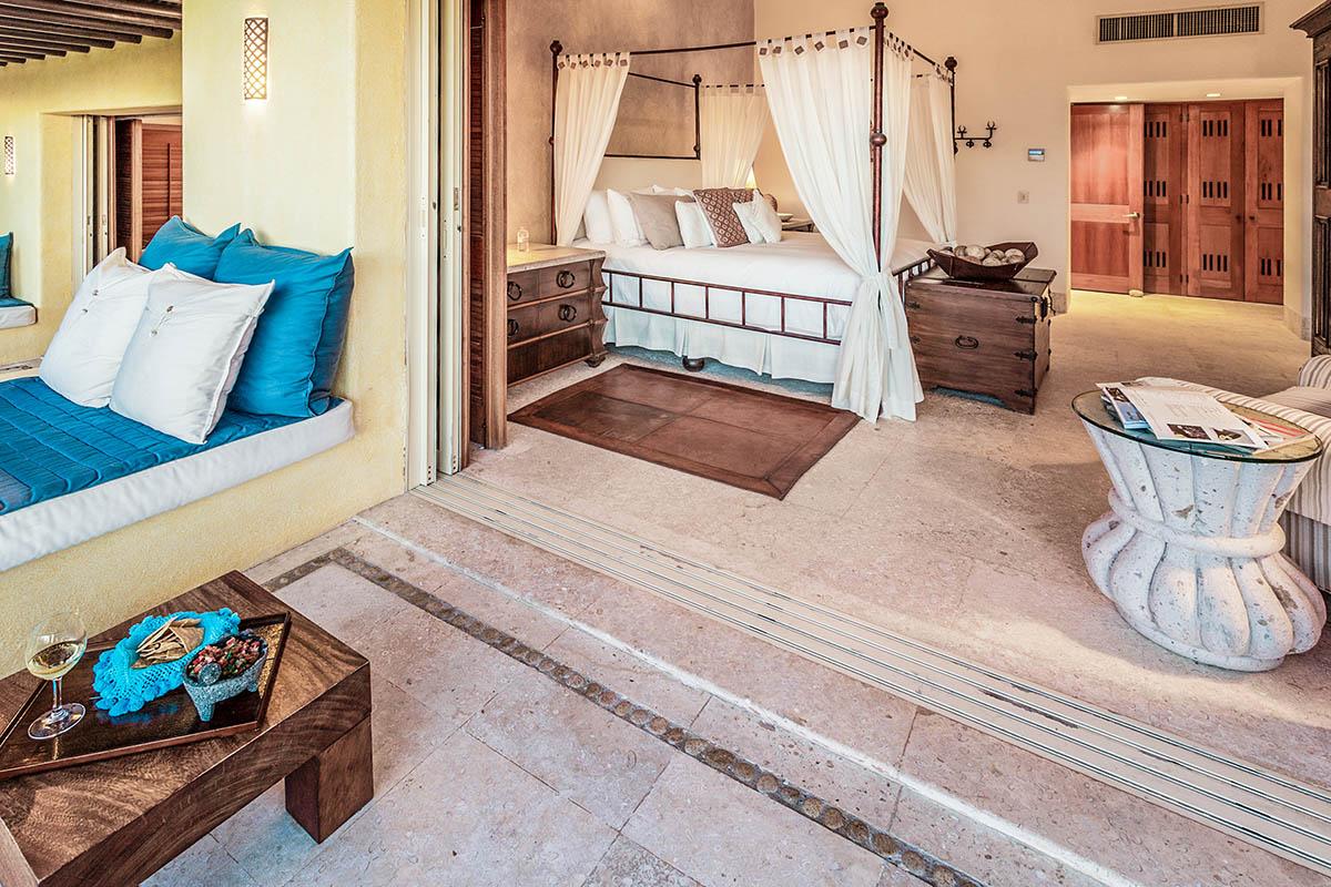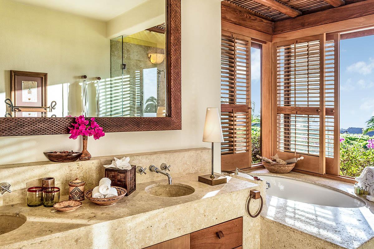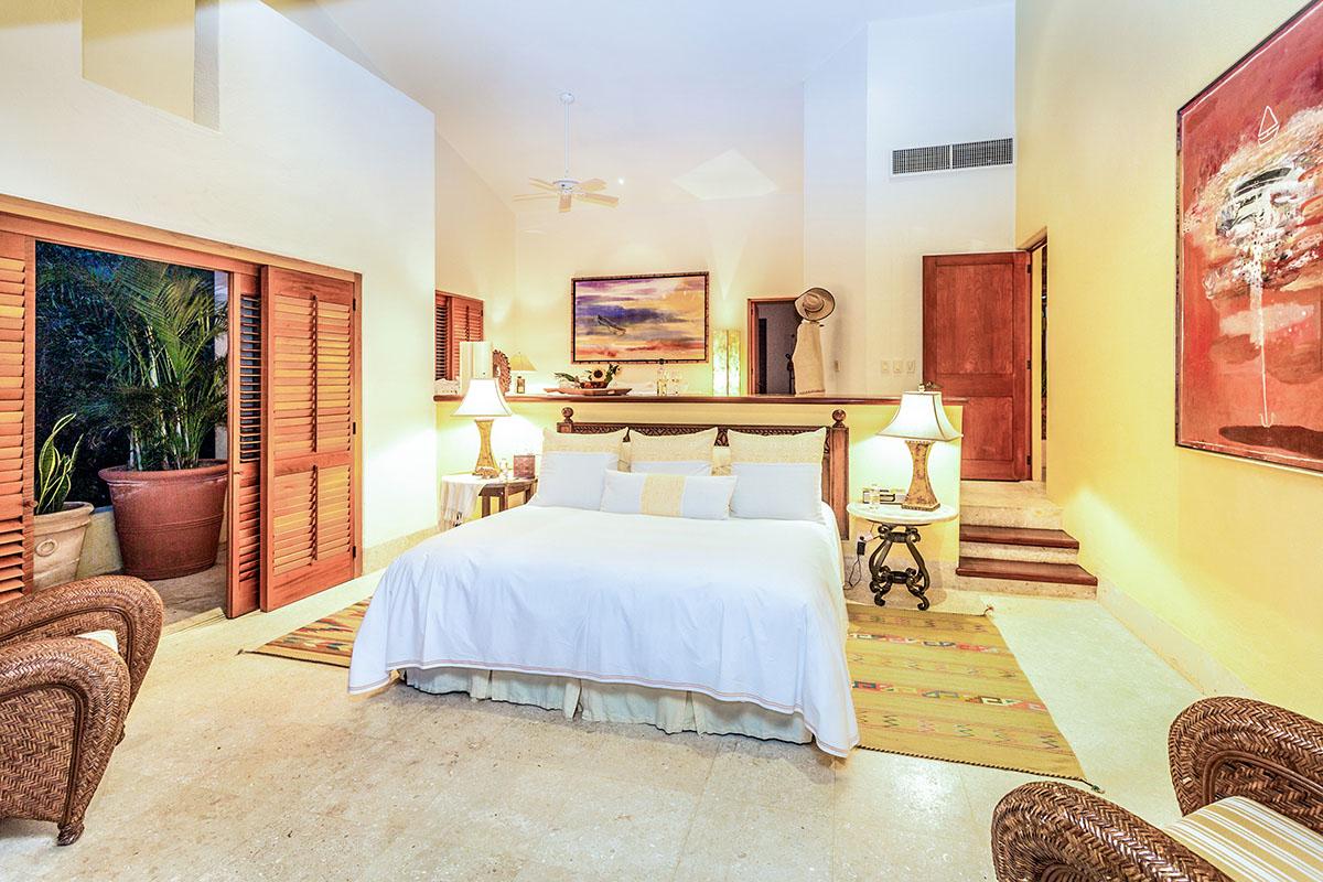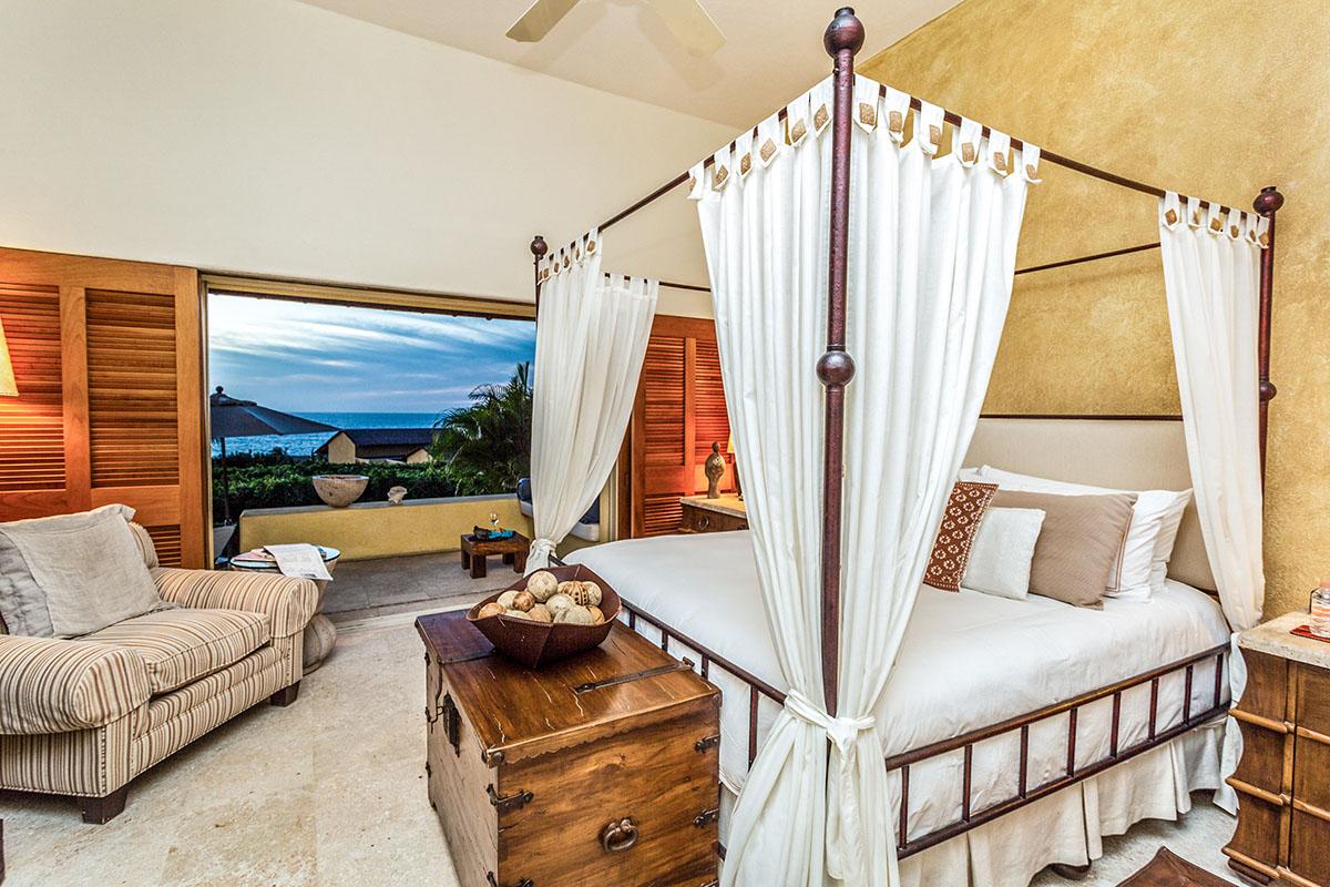 The Second suite is romantically Mexican with a four poster bed complete with billowy white drapery. Neutral tones throughout add to the special ambience of this room which is only enhanced by the breathtaking views from the king sized bed and private patio. The bathroom too is unique. A wall of shuttered windows open up to the view of the Pacific or can offer total privacy. An oversized tub, walk in shower and double vanities complete the Zen like experience.