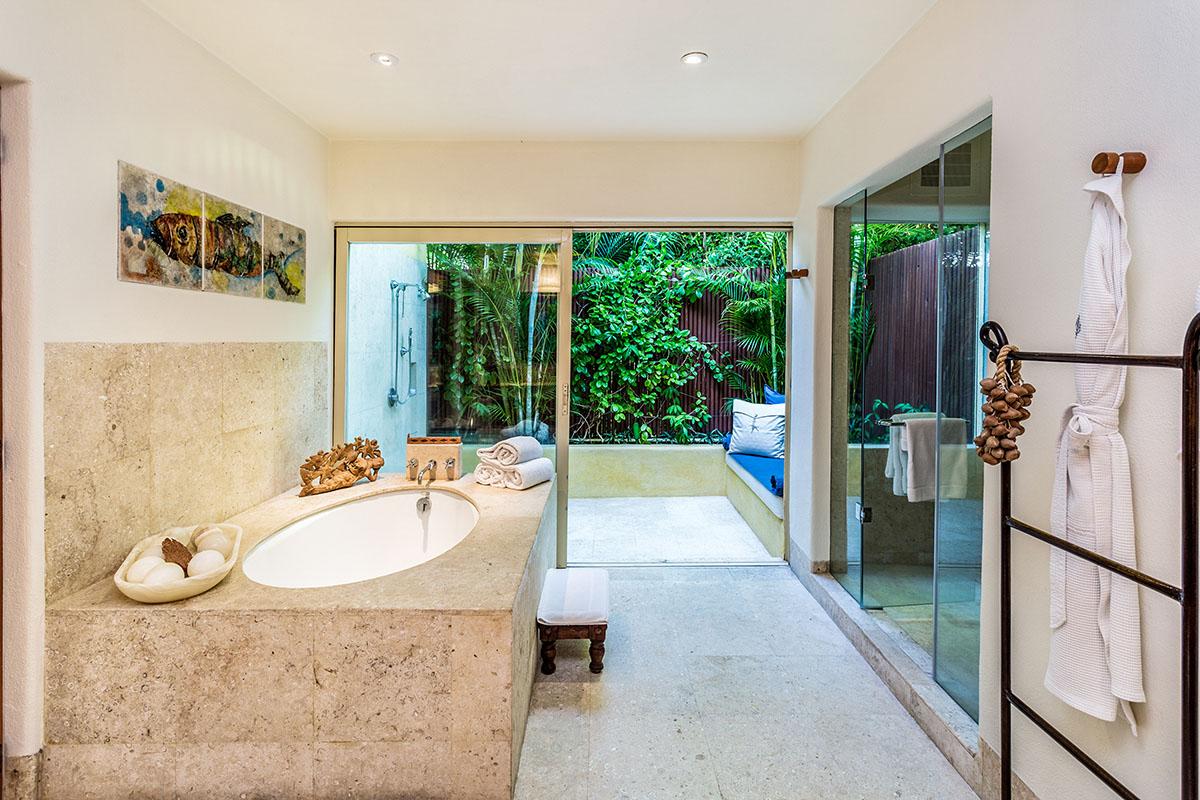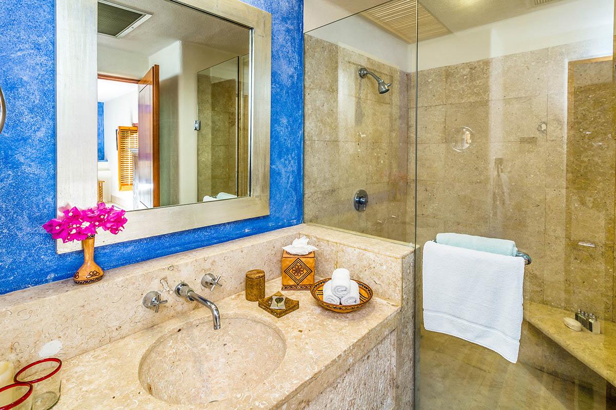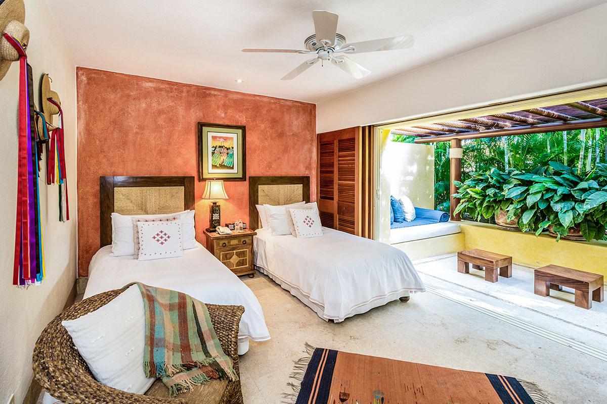The Third suite has two twin beds that can be seamlessly put together to make a king. A totally secluded patio with 2 day beds is a wonderful retreat to read, nap or contemplate your next excursion. The stunning bathroom with a walk in shower is done in local Tekul stone that adds a rosy glow to any tan. Double Copper sink vanities and hand carved Mexican mirrors all add to the ambience.
