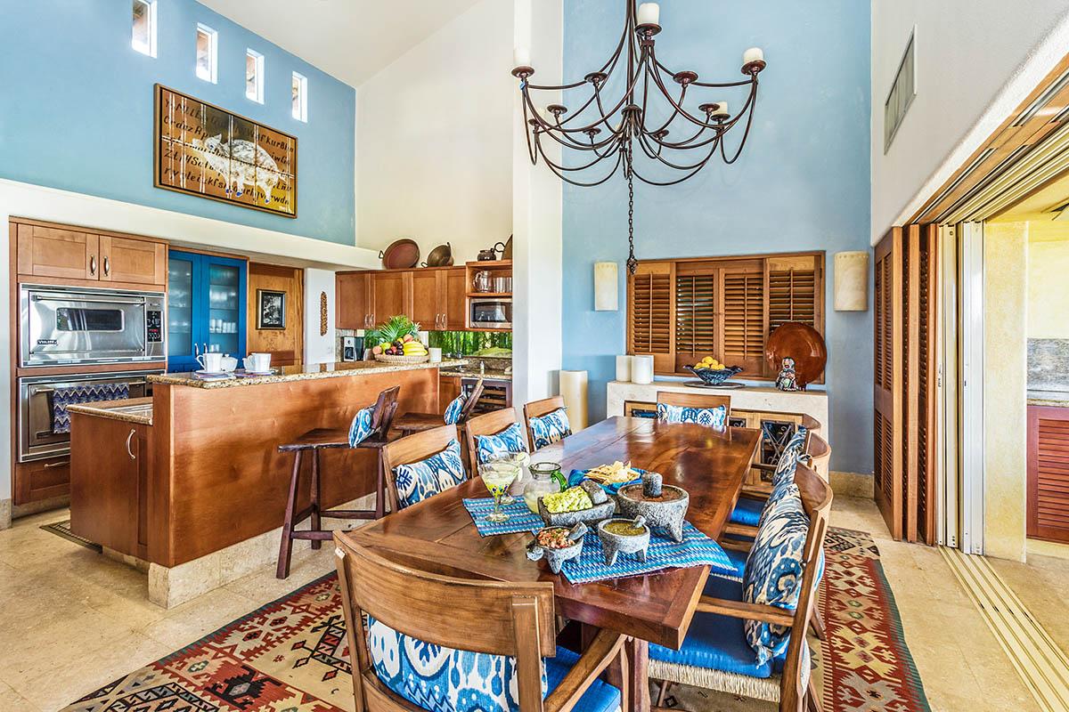 The exterior dining area has a Viking grill and rotisserie, wet bar, ice maker and exterior “beer” fridge. Lush tropical foliage, private pool, super private grassed area all make this Punta Mita villa a perfect vacation venue for anybody with discerning tastes.