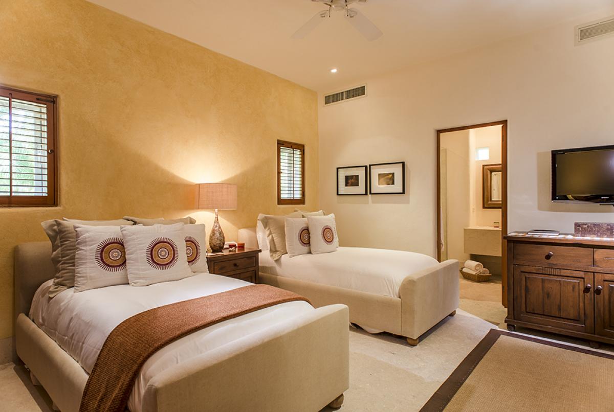 - Bedroom 4: 2 Queen beds, private patio with day beds, garden views, en suite bathroom with walk-in shower and tub, iPod dock, alarm clock, DVD player, deposit box, toiletries, hairdryer, bathrobes