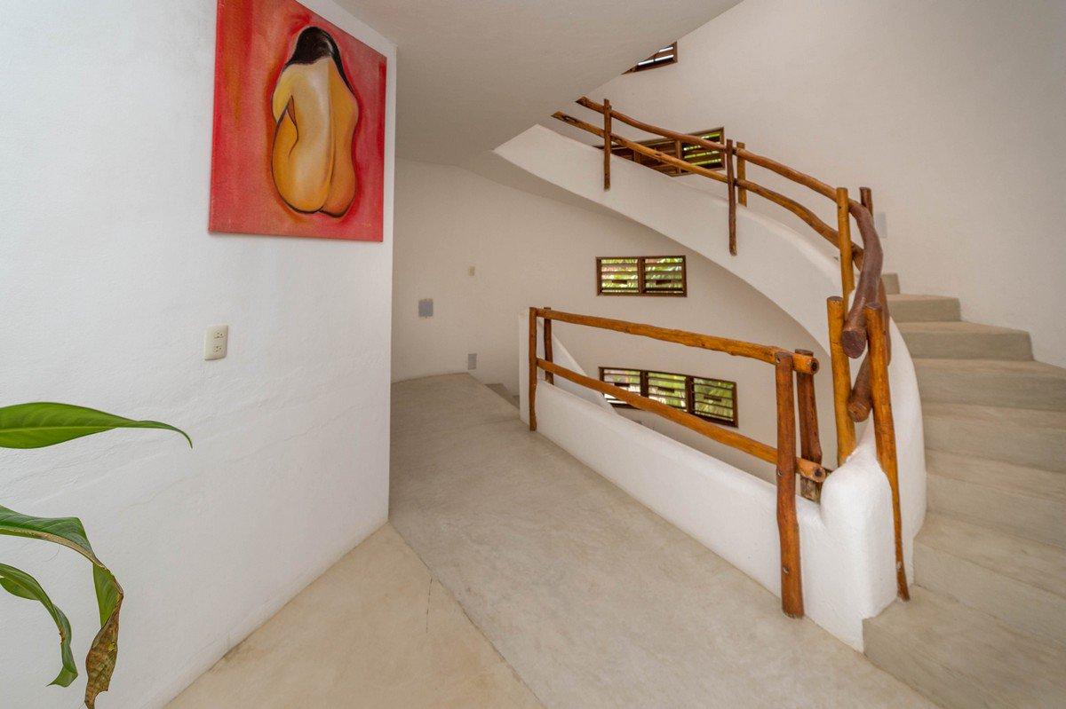 The finishes are consistent with the theme of casual, vacation luxury, but one that emphasizes the uniqueness of the Tulum location and ecology. Each large bedroom features high end bath products of both local and international origin, high thread count linens and pillow top mattress’, set against the cool, sleek polished concrete, stone and wood finishes of the bedrooms, floors and bath vanities. Of course, Casa Carolina features Wind and Solar power and a backup generator to meet the needs of any guest 24/7. Additionally, we have taken extra care to lessen our and your footprints in this pristine area by having a grey water waste system, 2 wells and purified water.