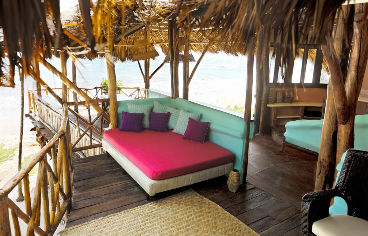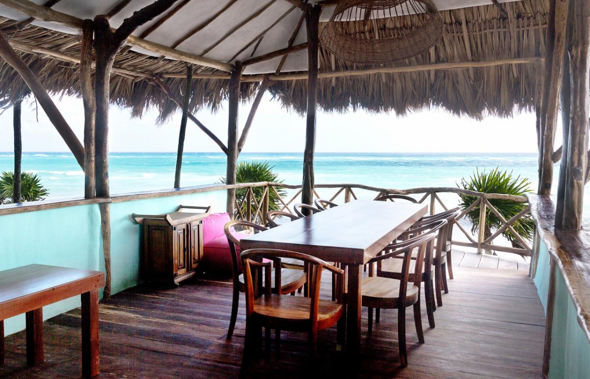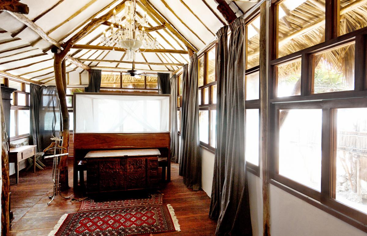 This large private oceanfront house claims some pristine jungle. The casa emerges from the dense natural greenery to stand free on high rocks deep breathing fresh winds of the Caribbean. An intricate piece of beach architecture constructed primarily of wood, the building is irrefutably one of the most unique, meaningful, and comfortable accommodations in Riviera Maya.