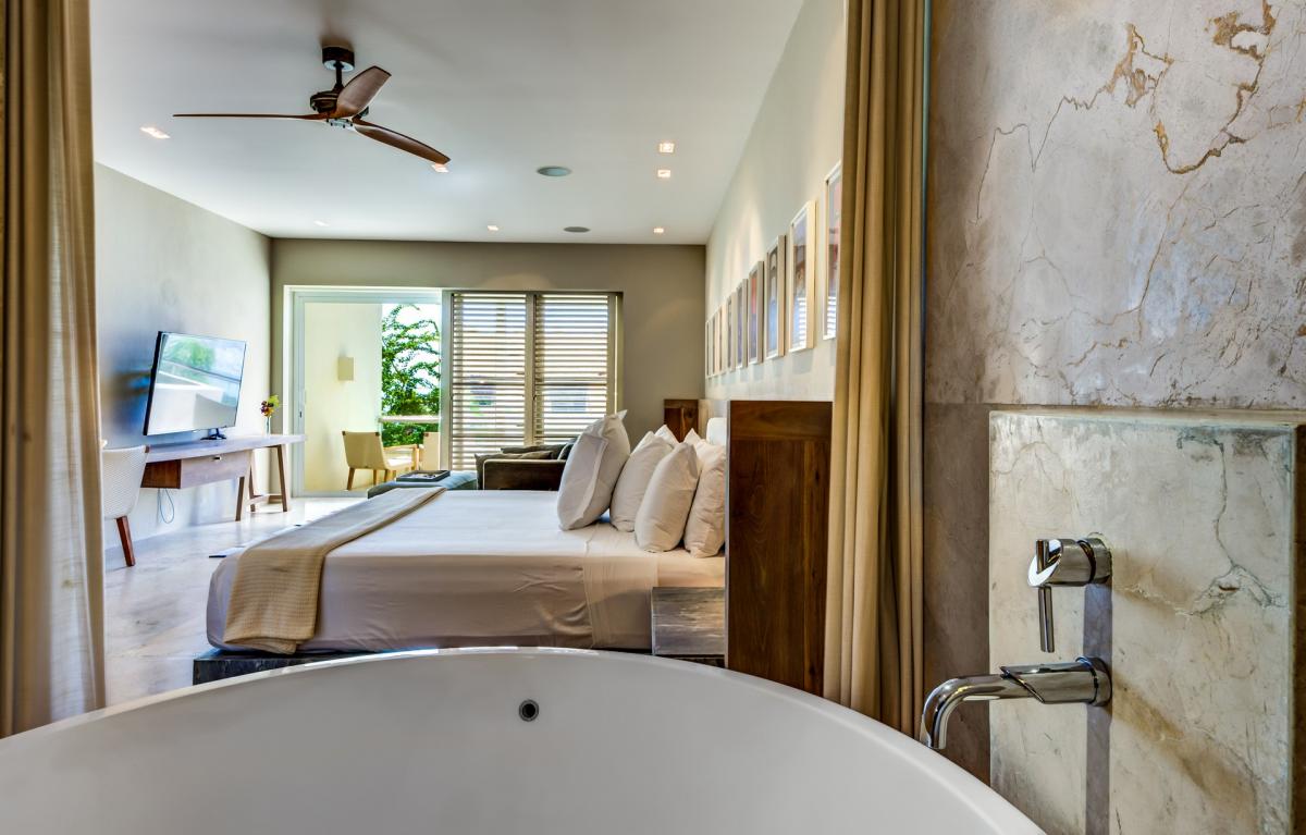 - Bedroom 2: King bed, en suite bathroom with shower and bathtub, private terrace, AC, ocean view