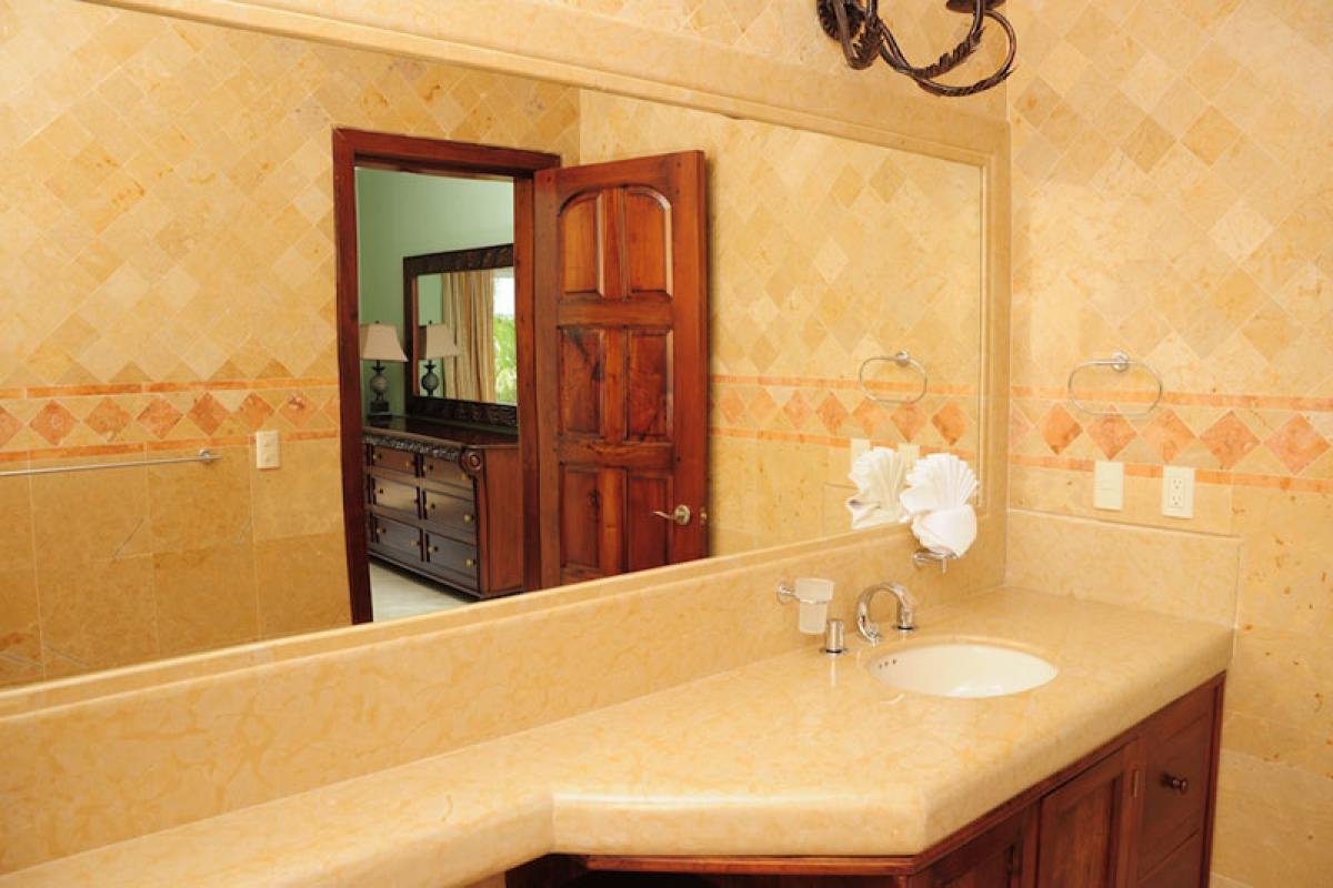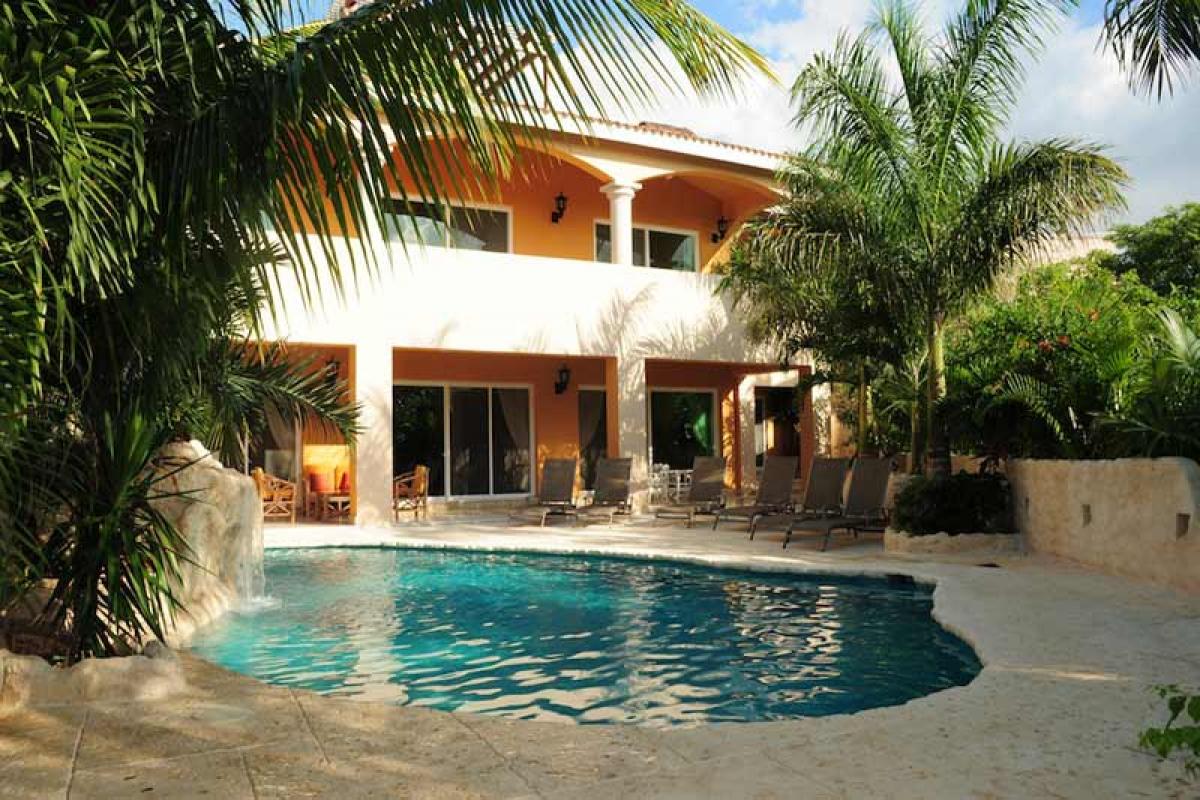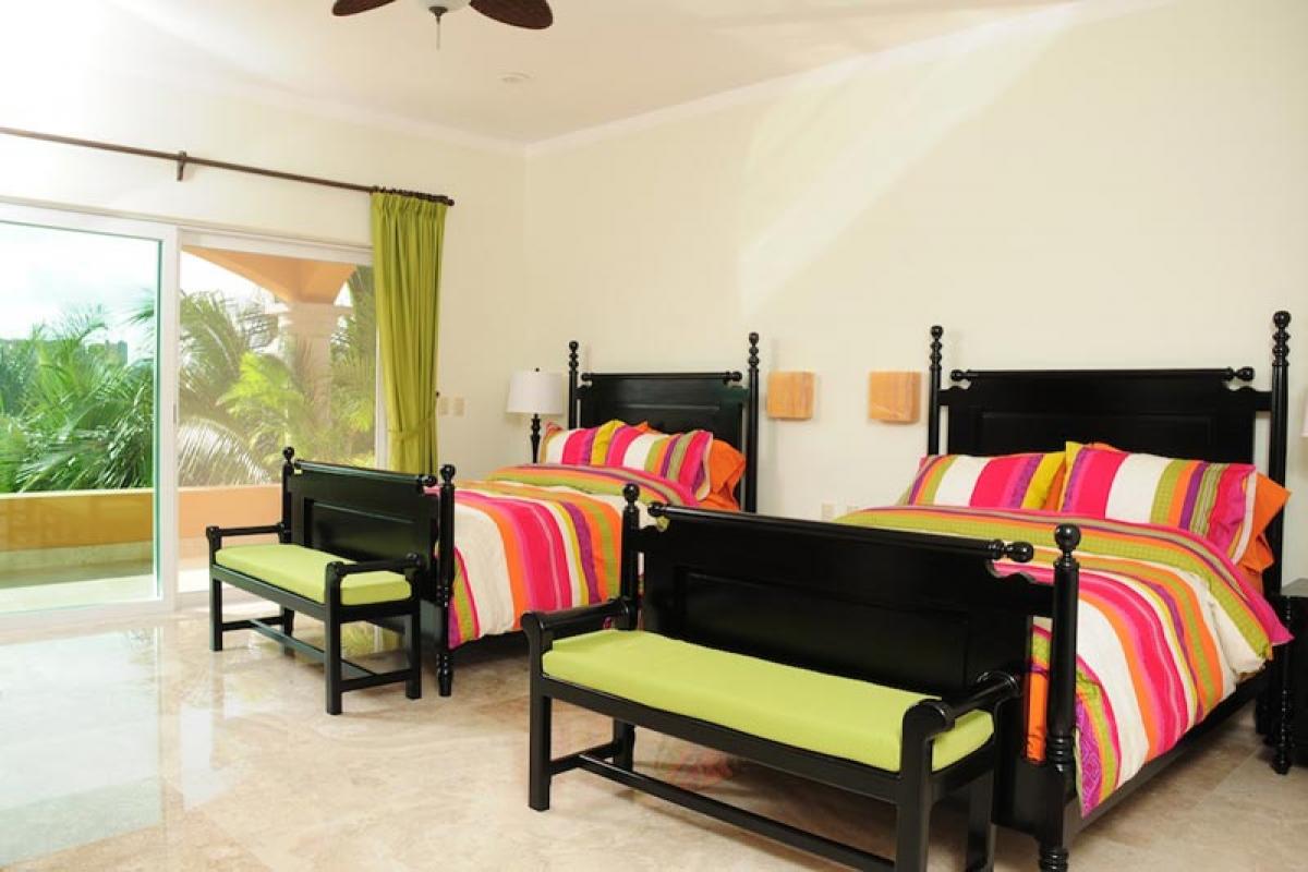 Hacienda Las Palmas features five artistically designed air-conditioned bedrooms and five bathrooms. One bedroom is furnished with two queen size beds and four bedrooms are furnished with one king size bed. One bedroom is located on the first floor with direct access to the pool area. The other four suites are located on the second floor and are connected by a long Romeo and Juliet balcony, overlooking the pool and golf course. Relax by the pool or talk a short walk to the beach. For the golf enthusiasts, the Puerto Aventuras Golf Course is only a three minute walk away. Gaze at the stars at night on the 360 degree rooftop observation deck. Enjoy indoor or outdoor dining and let the chef prepare you a gourmet meal that is sure to impress. Hacienda Las Palmas is the perfect Riviera Maya villa rental for a memorable vacation.