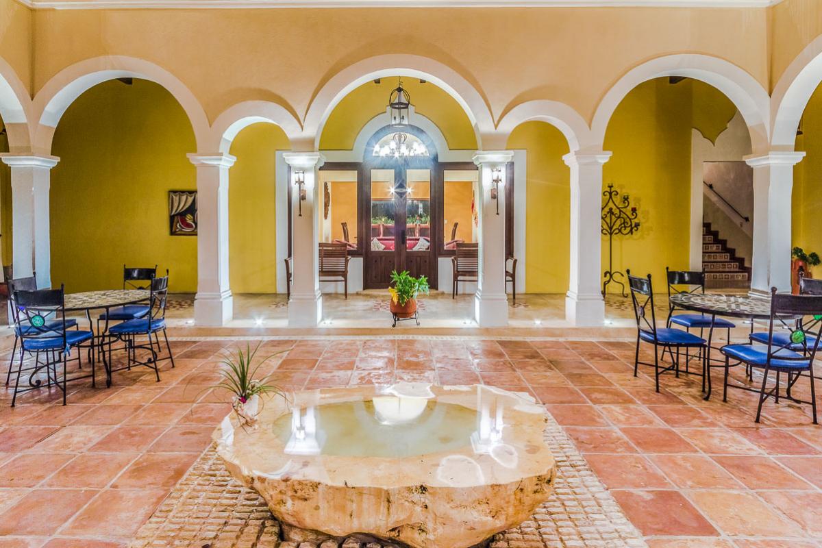 The first thing you see as you enter Hacienda Majica is the full size private tennis court. Look to you left and you will see a beautiful lime stone mural, the feather serpent, the Mayan god Kukulkan. Walking under the arches of this magical court yard and you will see an alcove with seating... spectators have a perfect birds eye view of tennis matches in progress. There is night lighting should the games continue after sun set. Guests enjoy listening to their favorite music on the surround sound system and there is a wet bar and a separate full bath conveniently located here.