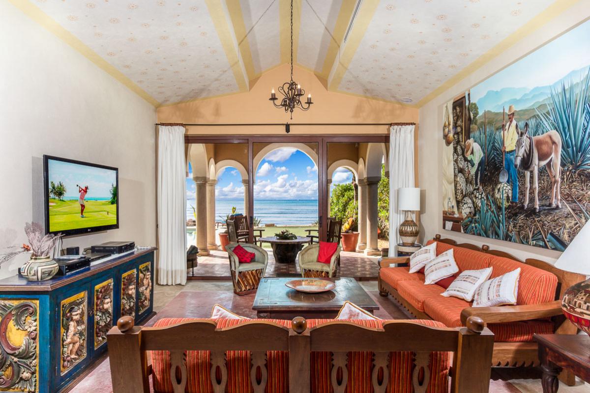 The gourmet kitchen is beautiful with colorful Talavera tiles, carved wooden furniture and hand painted chairs with Charros, the Mexican cowboys. The Chefs and Mexican cooks are on hand should you wish to sample local delicacies or more international fare. The ocean front living room is wonderful, with hand painted ceiling, beautiful decorations, satellite TV and Ipod Dock. This area leads to the indoor dining bar area where you can mix your favorite cocktails or walk out to the terrace with outdoor dining and enjoy the glorious Caribbean!