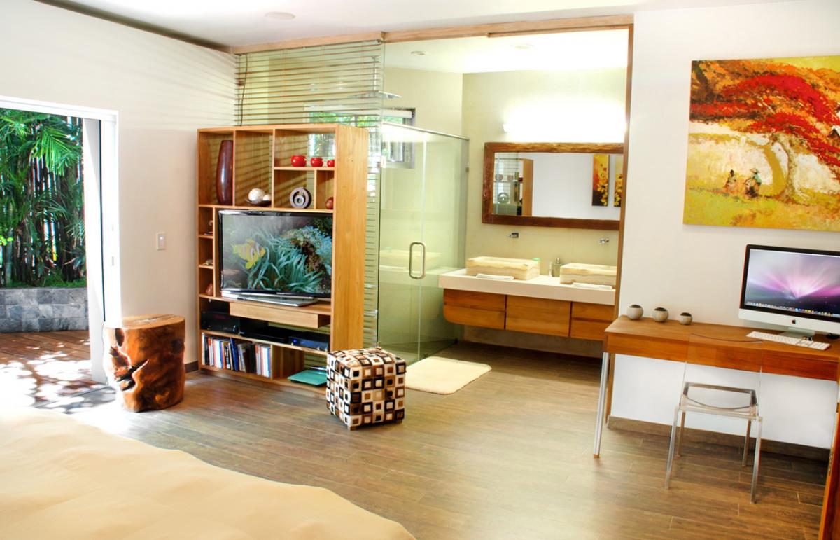 | First level, King bed, en suite bathroom, AC, ceiling fan, electric shades & blackout curtains, Jacuzzi, outdoor lounge furniture, safe, Telephone, US Direct TV, window screen, private terrace with ozone tretament jacuzzi pool, lush jungle views |