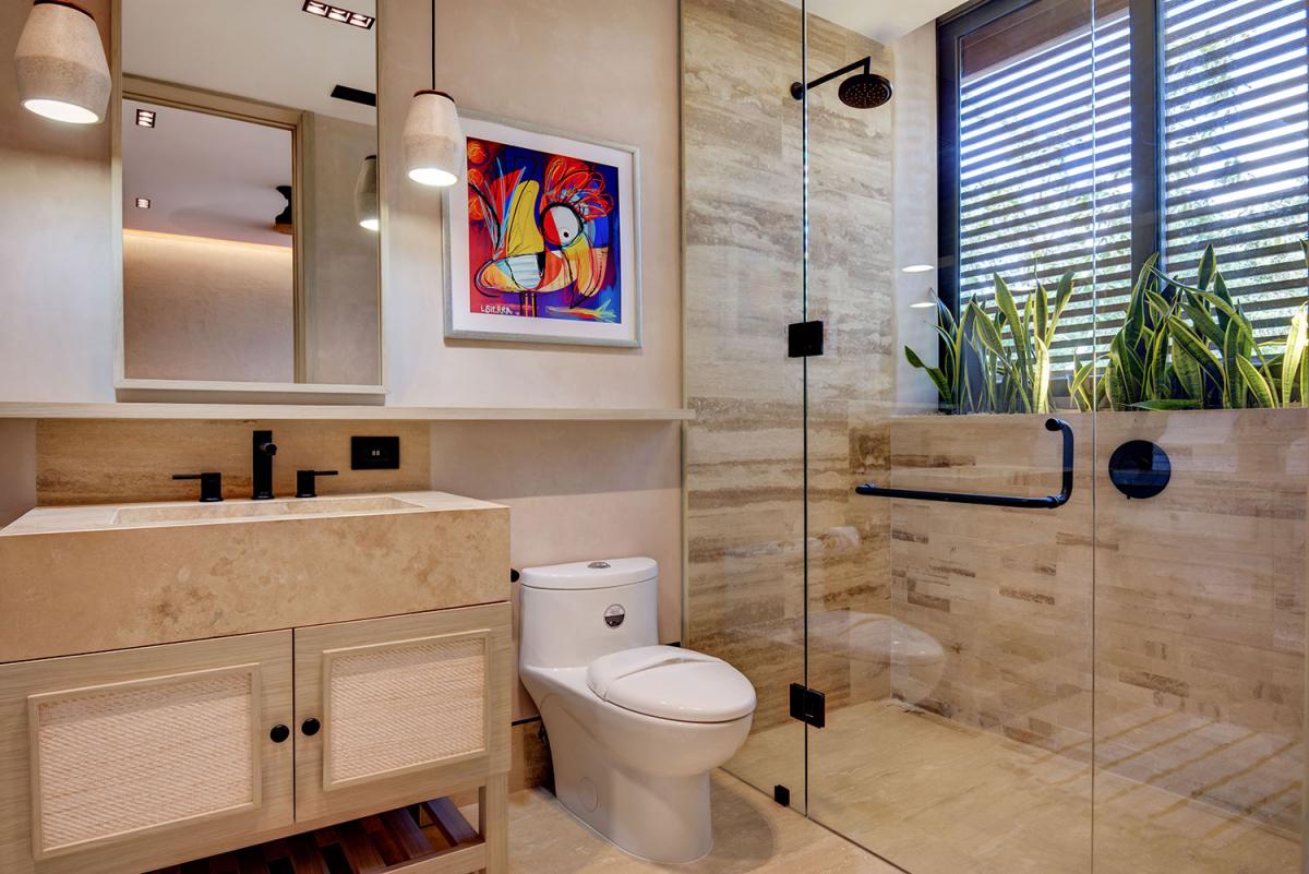 Palm Villa, located in the prestigious Corasol community in Playa del Carmen, is a masterpiece of seamless indoor-outdoor living and organic design. This five-bedroom villa is a perfect blend of modern architecture and natural surroundings, providing an unparalleled experience for family vacations. With 900 square feet of outdoor space, including a stylish plunge pool, terrace lounge, and expansive balconies, the residence is framed by lush greenery that offers both beauty and privacy. Its open-concept cubic layout integrates the villa's elegant interiors with the vibrant natural environment, creating a harmonious retreat.