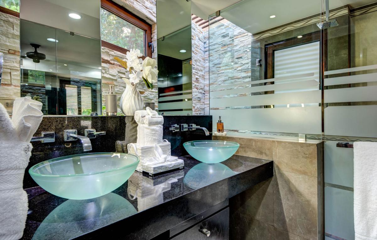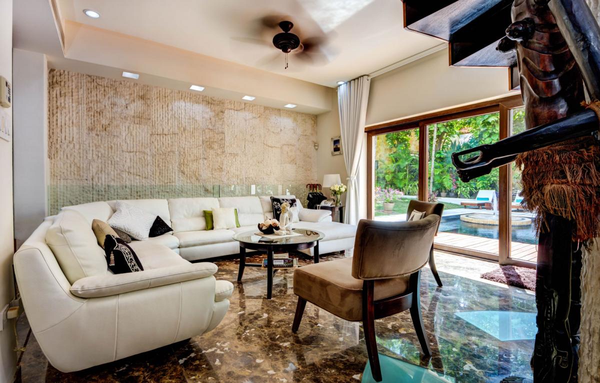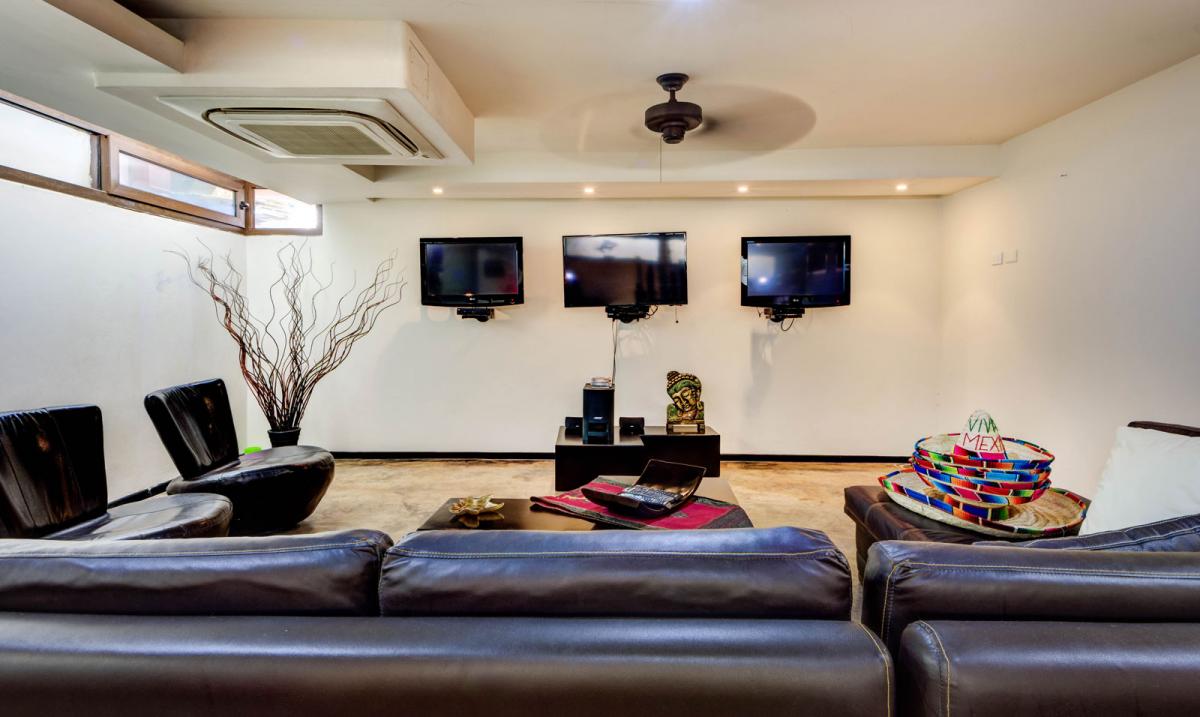 In addition to the large exterior spaces, the villa offers a fully equipped kitchen, media room and living area.