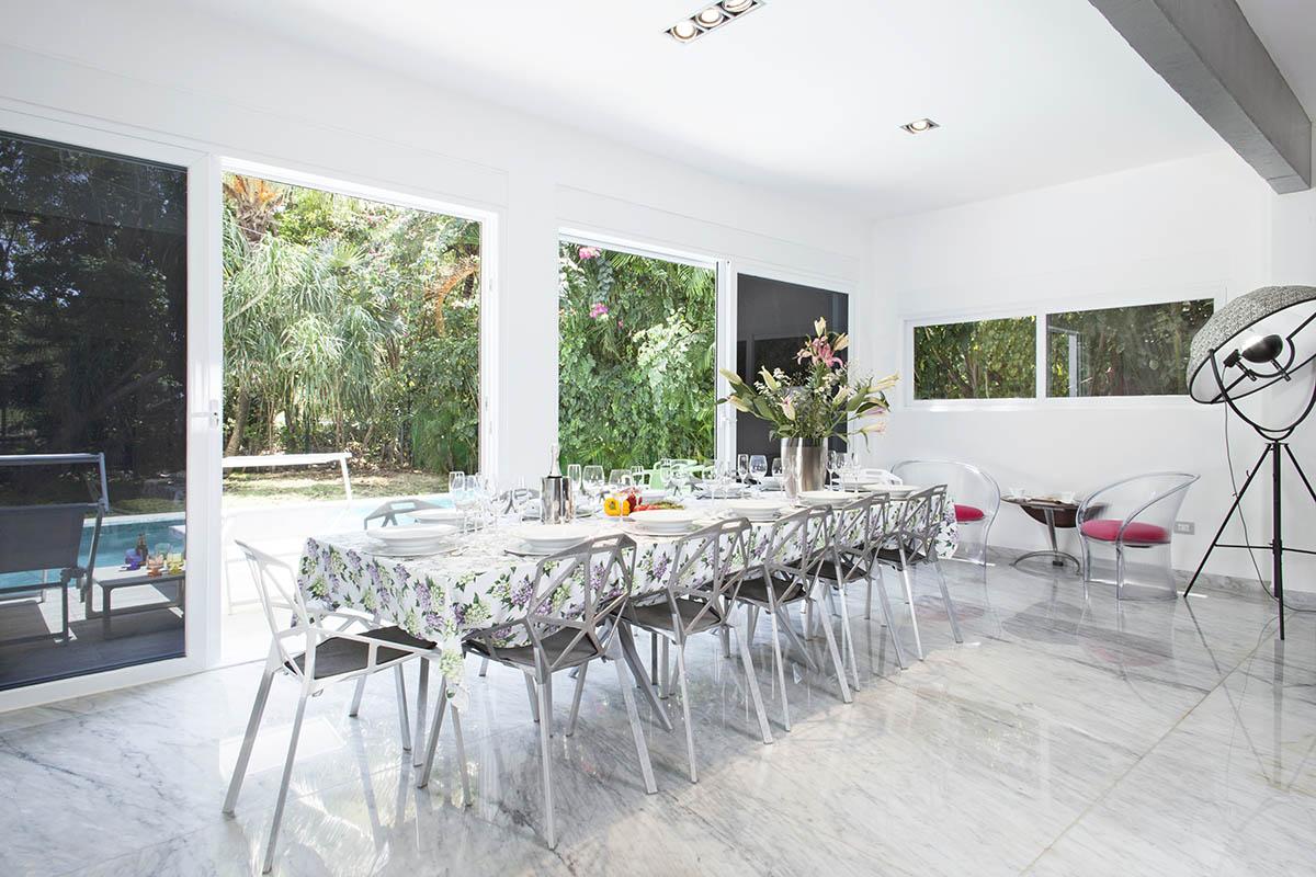 The ground floor offers access to a large living area, ample sofas and a 65 " Smart TV equipped with Sky Plus, Netflix, Youtube, Dvd Player, etc. The dinning area is furnished with an elegant glass dinning room table for 12 guests equipped with tableware worthy of a 5-star restaurant.