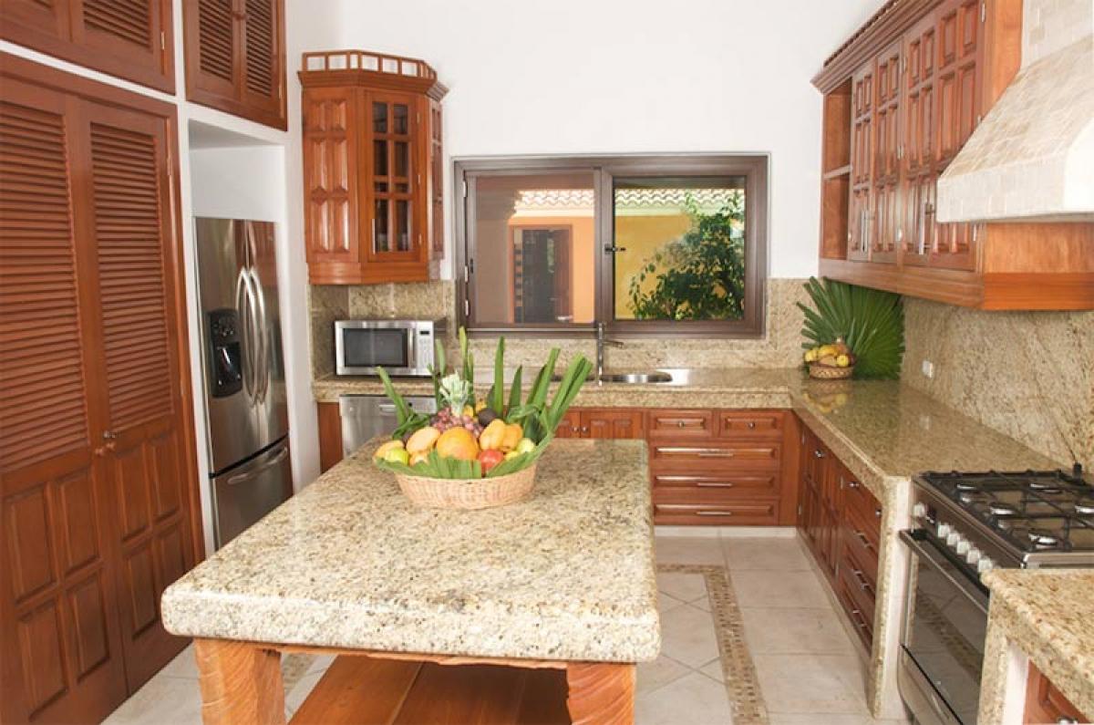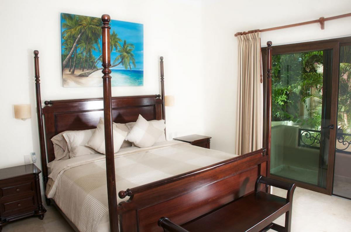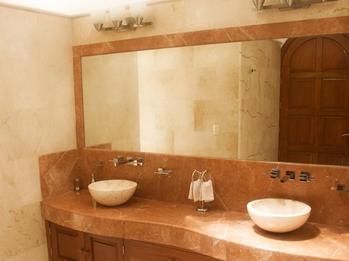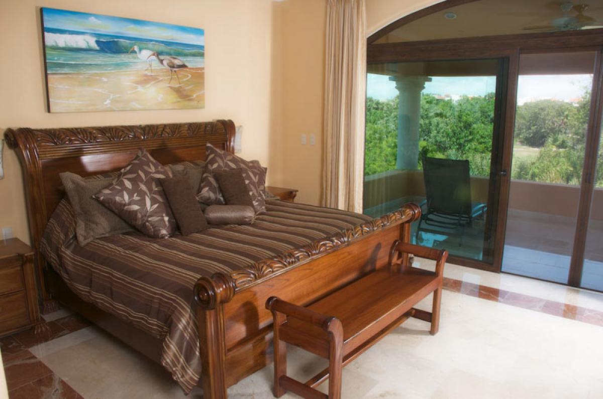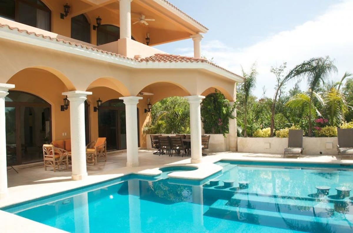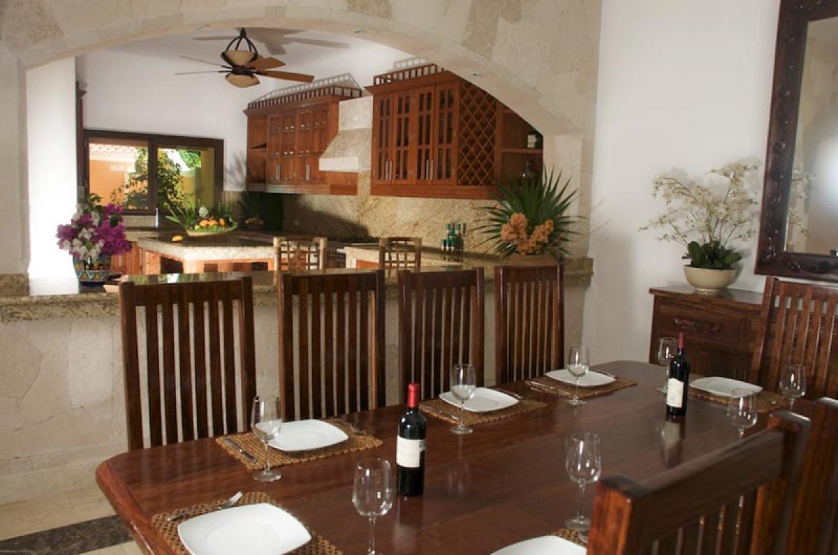 The quality is clearly evident as you approach the front gate of Villa Gran Orquidea. The meticulous stone work and elegant wrought iron of the entry courtyard sets the stage for high expectations. On your way to the front door, on the left is the two story guest house. The guest house features two apartments, upper and lower, each with its own kitchen, living area, and bedding consisting of one queen and one single bed. Inside Villa Gran Orquidea on the lower level is the gourmet kitchen, formal dining room, living room, and one bedroom. The kitchen, dining room and living room all have a view of the pool through the glass doors. The kitchen has granite countertops, a breakfast bar, an island, stainless steel appliances and solid mahogany cabinets. There is a dishwasher, six burner stove, large refrigerator, microwave, toaster, blender, coffee maker, ample cook-ware, place settings, etc. The villa's chef is included and is available to cook meals if you wish. On the other side of the breakfast bar is the formal dining room which seats six. Across from the dining room is the living room with an L-shaped couch, coffee table, and some additional seating. Both the living and dining rooms have beautiful chandeliers and thirteen foot high ceilings. Doors open from the living room and dining room to the pool and pool terrace. Villa Gran Orquidea is located just a couple minutes from Puerto Aventuras' marina and five minutes from the main beach on Fatima bay. The marina has many restaurants, tourist services, and adventure tour providers. The beach is protected by a reef that reduces the surf and provides some nice coral formations for snorkeling.