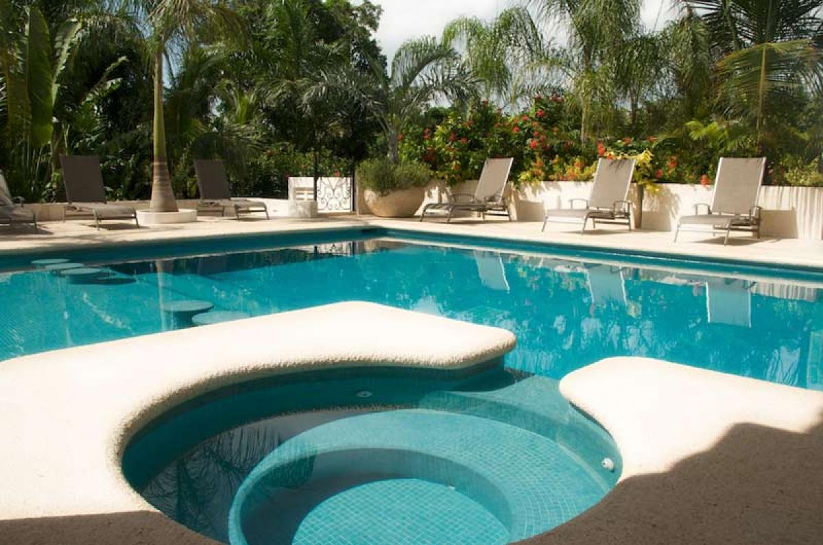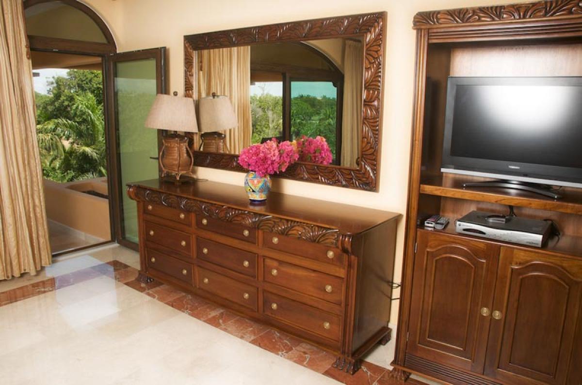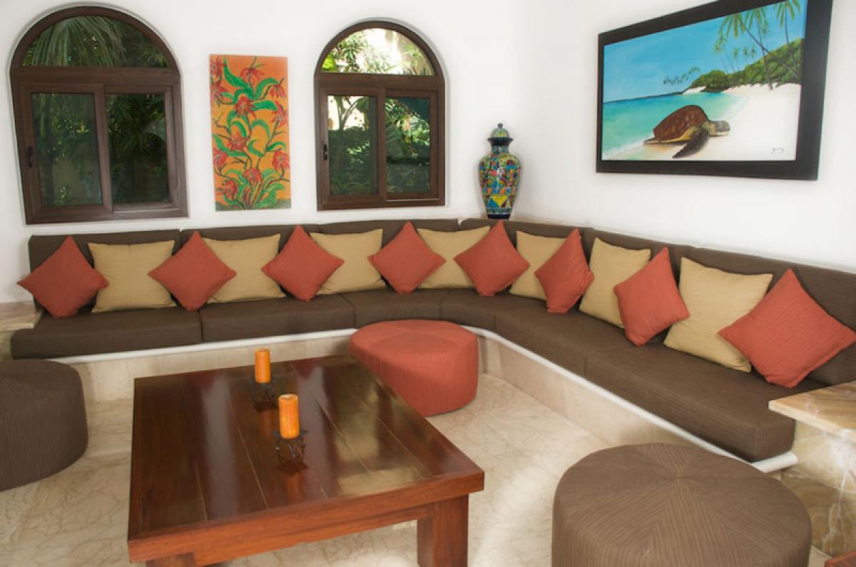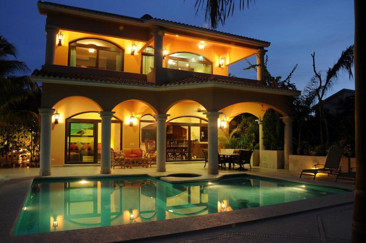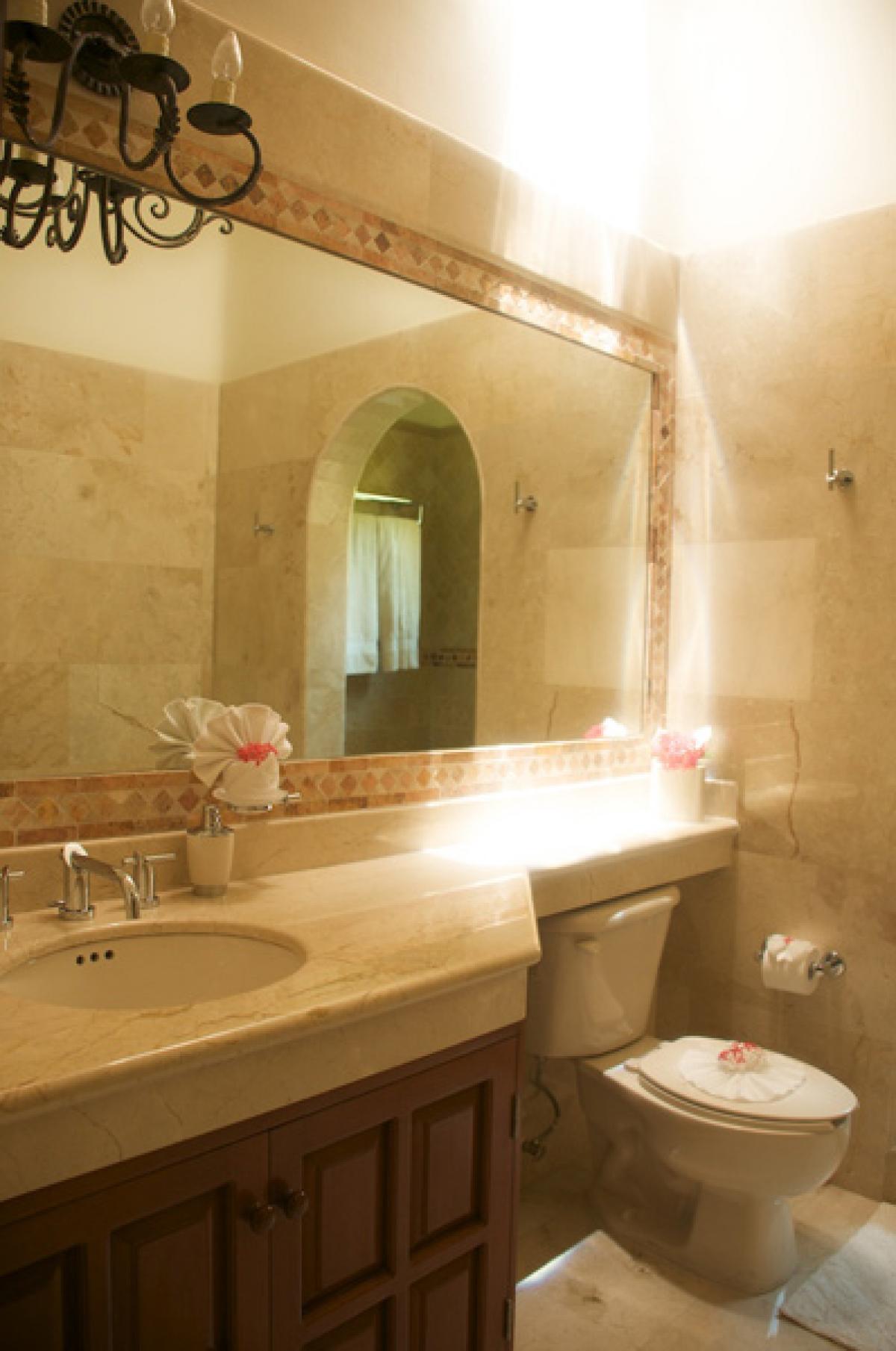 The quality is clearly evident as you approach the front gate of Villa Gran Orquidea. The meticulous stone work and elegant wrought iron of the entry courtyard sets the stage for high expectations. On your way to the front door, on the left is the two story guest house. The guest house features two apartments, upper and lower, each with its own kitchen, living area, and bedding consisting of one queen and one single bed. Inside Villa Gran Orquidea on the lower level is the gourmet kitchen, formal dining room, living room, and one bedroom. The kitchen, dining room and living room all have a view of the pool through the glass doors. The kitchen has granite countertops, a breakfast bar, an island, stainless steel appliances and solid mahogany cabinets. There is a dishwasher, six burner stove, large refrigerator, microwave, toaster, blender, coffee maker, ample cook-ware, place settings, etc. The villa's chef is included and is available to cook meals if you wish. On the other side of the breakfast bar is the formal dining room which seats six. Across from the dining room is the living room with an L-shaped couch, coffee table, and some additional seating. Both the living and dining rooms have beautiful chandeliers and thirteen foot high ceilings. Doors open from the living room and dining room to the pool and pool terrace. Villa Gran Orquidea is located just a couple minutes from Puerto Aventuras' marina and five minutes from the main beach on Fatima bay. The marina has many restaurants, tourist services, and adventure tour providers. The beach is protected by a reef that reduces the surf and provides some nice coral formations for snorkeling.