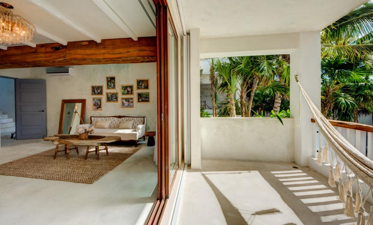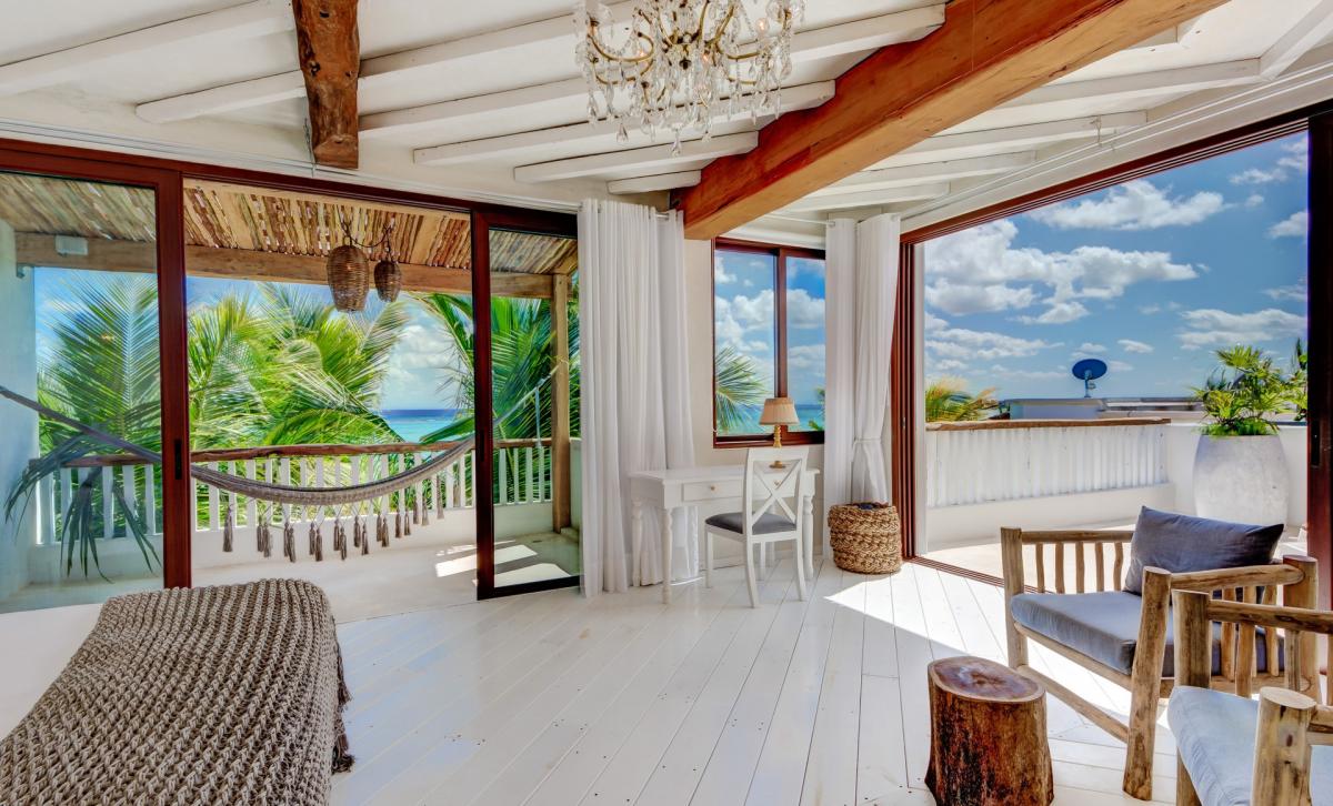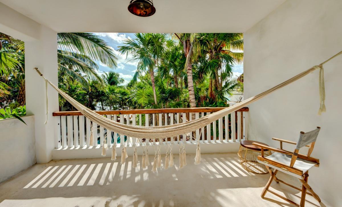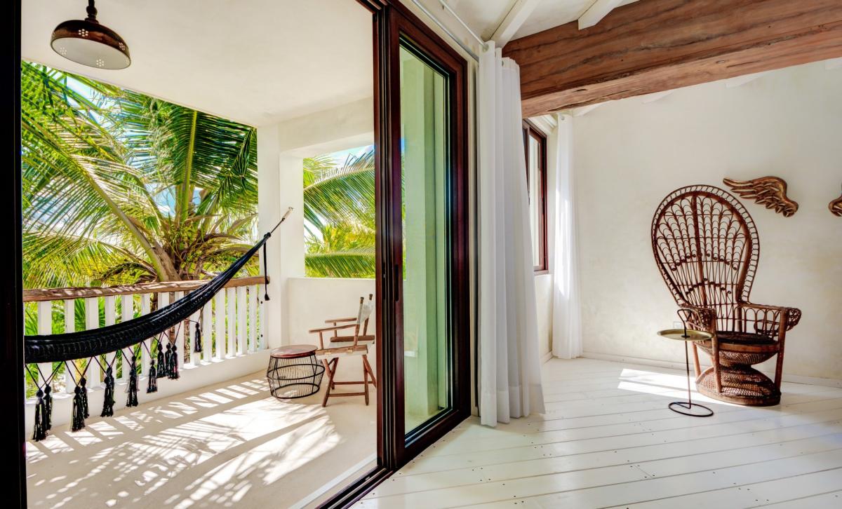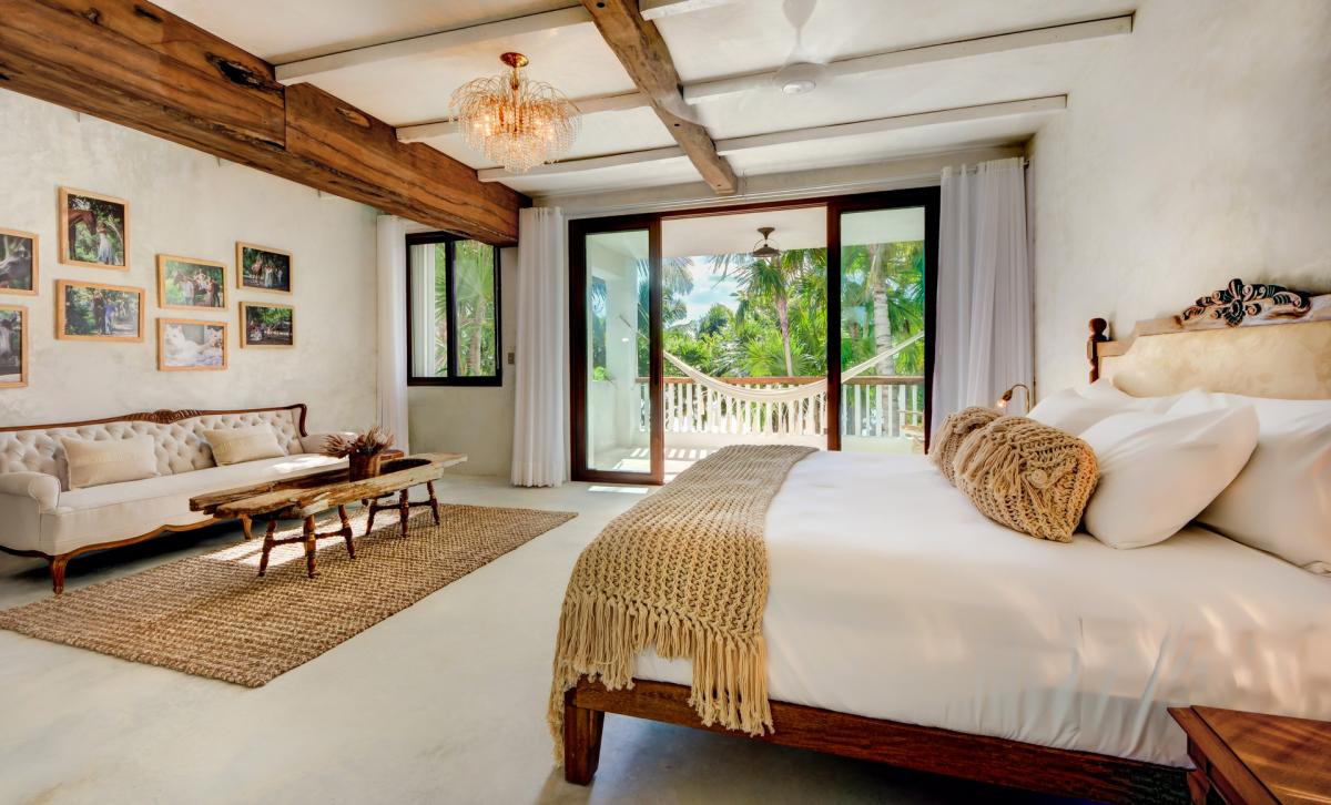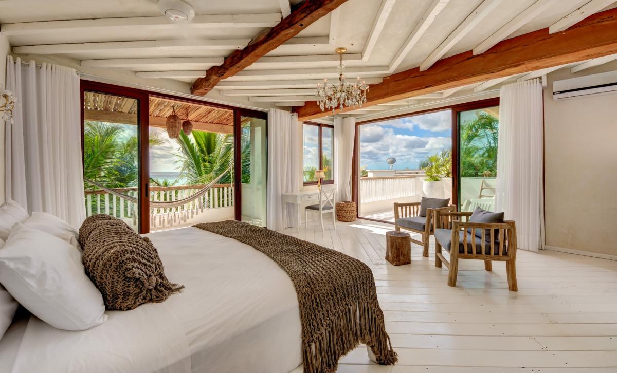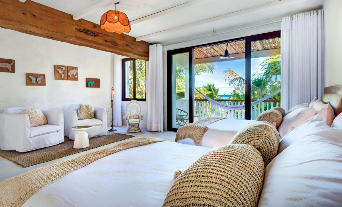 - Bedroom 2: Two double beds, en suite bathroom with shower and bathtub, AC, ceiling fan, closet, hammock, ocean view, private balcony, single bed