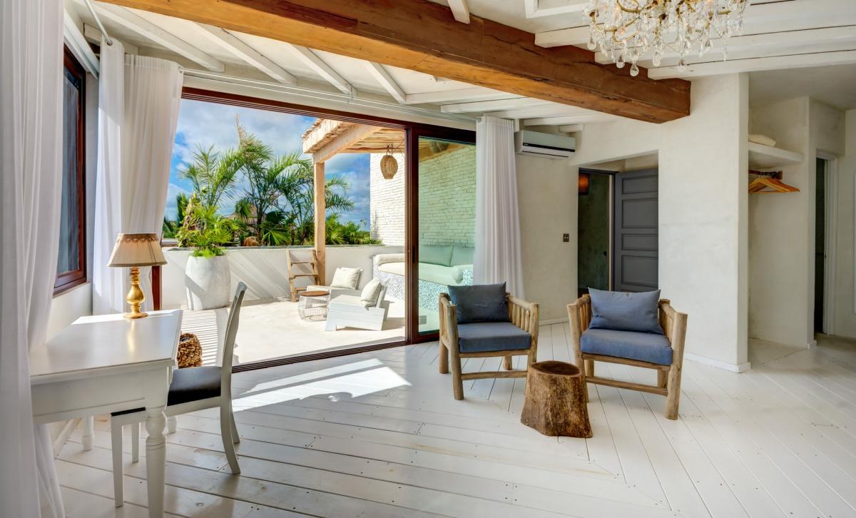 Rooms - As you walk upstairs, five uniquely designed suites greet you. Each suite features it’s own, bathroom, king-size bed and private terrace with ocean view.