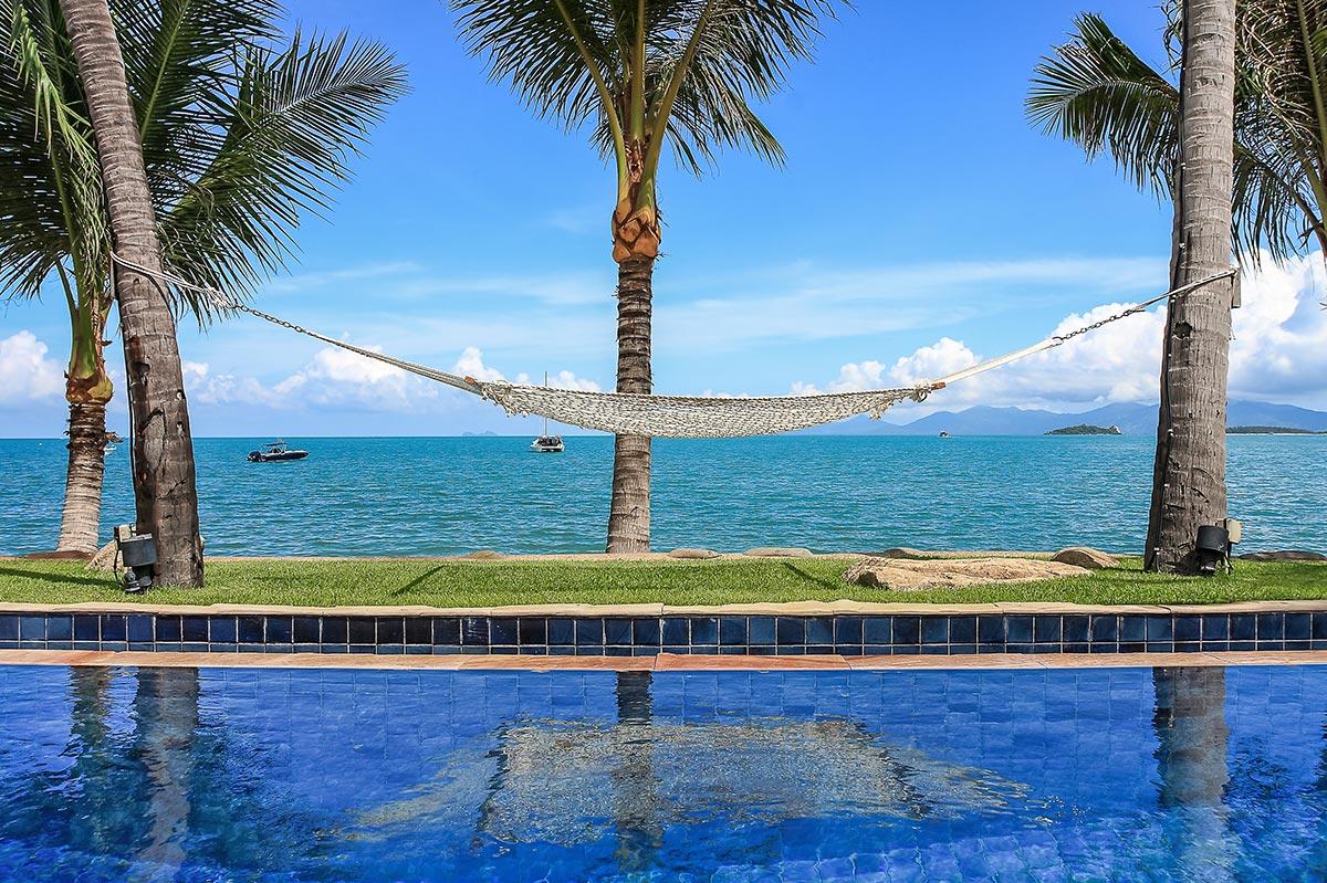 Ban Haad Sai is a large luxurious beach front villa comprised of 2 identical pavilions with spectacular sea views overlooking the truly inspiring golden Big Buddha Bay and its famous Temple, the Big Buddha. Ban Haad Sai offers the style and class of many of the region's top 'boutique' hotels. A truly exclusive and private holiday destination, offering relaxation and comfort in unique surroundings. The property opens on to the 3km white sand beach from the pool and lawn in a bay that is perfect for year round swimming, jogging and the stunning sunsets. The two pavilions, each with 330 sqm of living space and deck and courtyard area, are situated side-by-side overlooking the beautiful beach with Koh Phanghan in the distance. Each pavilion features 3 air-conditioned bedrooms (2 double and 1 twin), all with en-suite bathrooms. The master bedrooms overlook the beach and have sumptuous bathrooms including a secluded outdoor Balinese bath and shower. In addition to the 2 identical pavilions there is a third building, as you enter the property, that houses the air conditioned gym and the seventh bedroom. In addition there is a bathroom with a full size bath and shower that serves both the gym and the 7th bedroom. Each pavilion has its own private access, a fully fitted kitchen, indoor and outdoor dining areas and a large living room equipped with all amenities. All rooms are furnished and equipped to a very high standard. Sliding doors from the living areas and main bedrooms open onto large teakwood decks, ideal for dining or just relaxing. Surrounded with lush vegetation and mature coconut and tropical trees the setting preserves everyone's privacy. The pavilions share a 1,600 sq.m. walled gardens complete with Thai artifacts and a large double hammock in what can only be described as picture postcard setting. The 12 meter pool is floodlit and complete with a sunbathing area. All sitting out areas are equipped with deck furniture, loungers and umbrellas. And all this right by the beach with Koh Phan Ngan and Big Buddha on the skyline. Three resident full time staff that can organize a candle-lit beach dinner; a garden BBQ or a stylish indoor dinner party prepared by our qualified Thai Chef service at the villa. Or you can walk along the beach and choose from the nearby eclectic range of restaurants - either local or International.