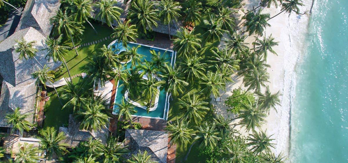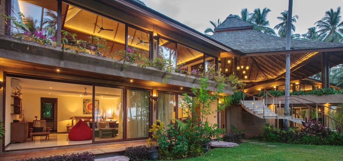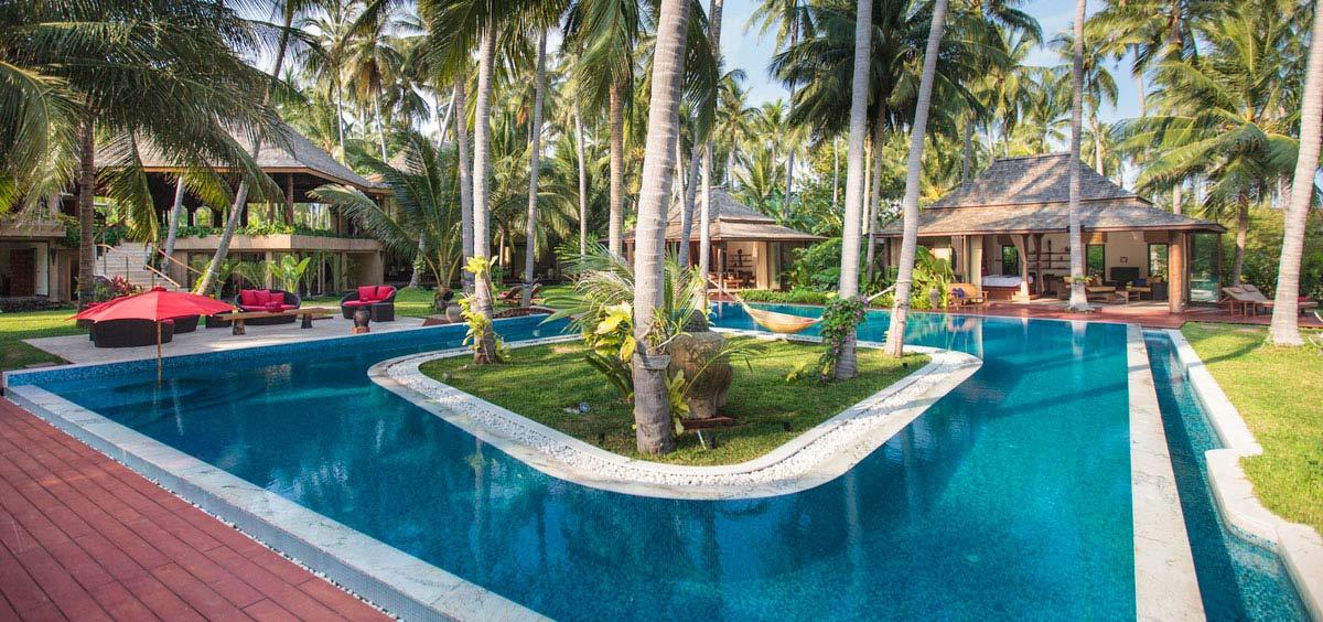 Undeniably beautiful, Villa Kalyana is an exclusive beachfront estate, within a private bay, on Koh Samui’s idyllic south shore. The lush palm tree plantation, fringed by the icing sugar sands and clear turquoise waters of the Gulf of Siam, set the surroundings for this unforgettable villa. This tropical villa haven features 14 bedrooms and can accomodate up to 26 adults plus several kids comfortably. Villa Kalyana is designed around the natural architecture of this private beachfront location. Structures blend seamlessly, housing the tropical foliage and further enhancing the natural beauty of this stunning beachfront location.