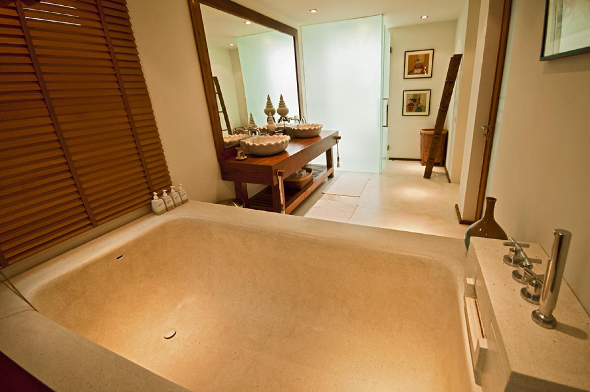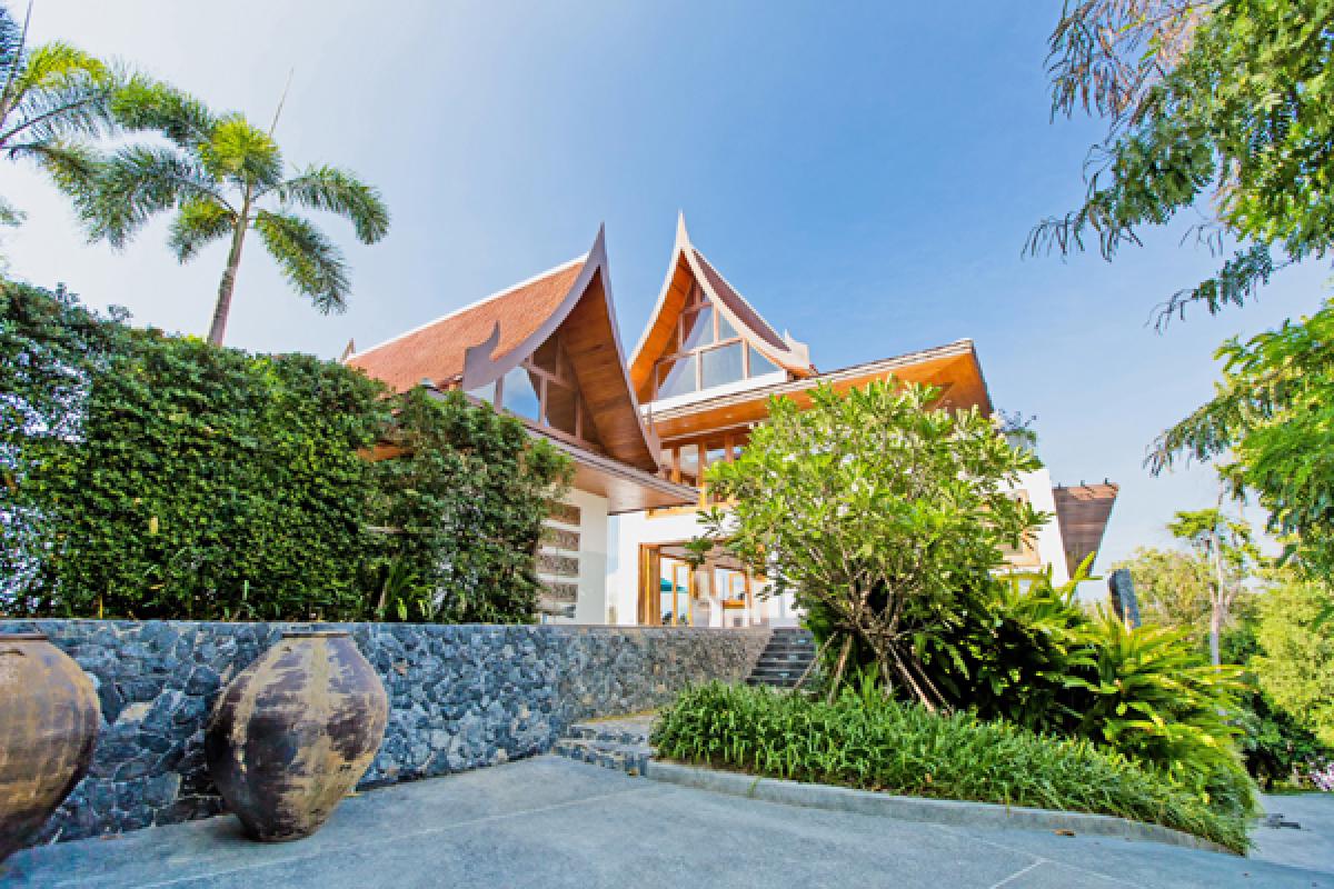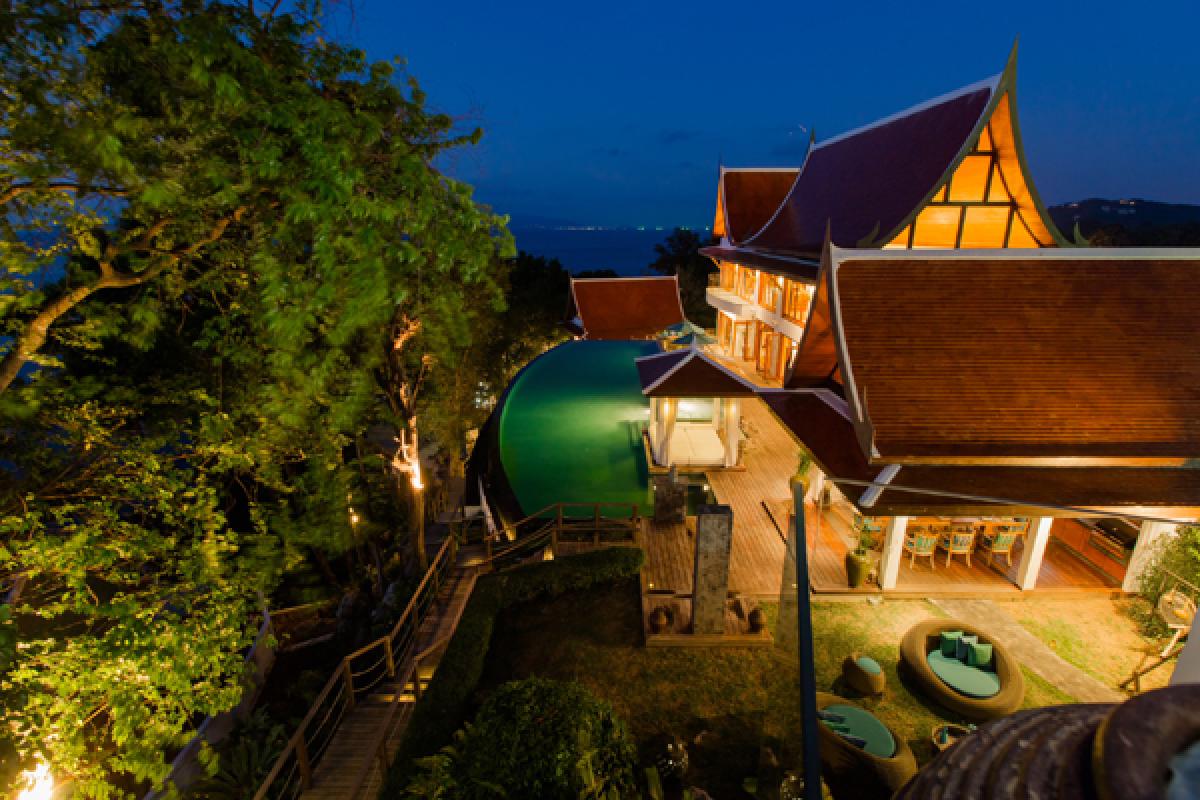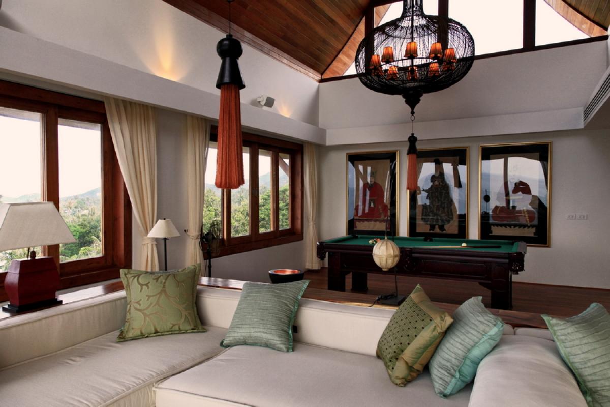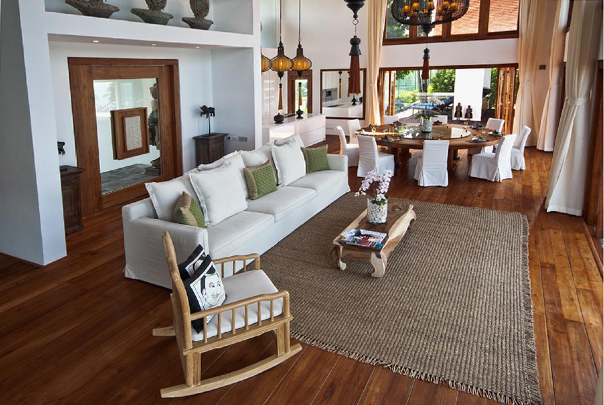 The main level begins with a majestic, stone-clad entrance that opens into a vaulted lounge and dining area furnished with fine contemporary Asian art and decor with wood and glass doors opening onto the large pool deck. The lounge extends into a spacious dining room with a 16-seater round solid Teak table, served by a fully fitted western show kitchen. A separate wet kitchen allows the staff to unobtrusively prepare meals for the guests.
