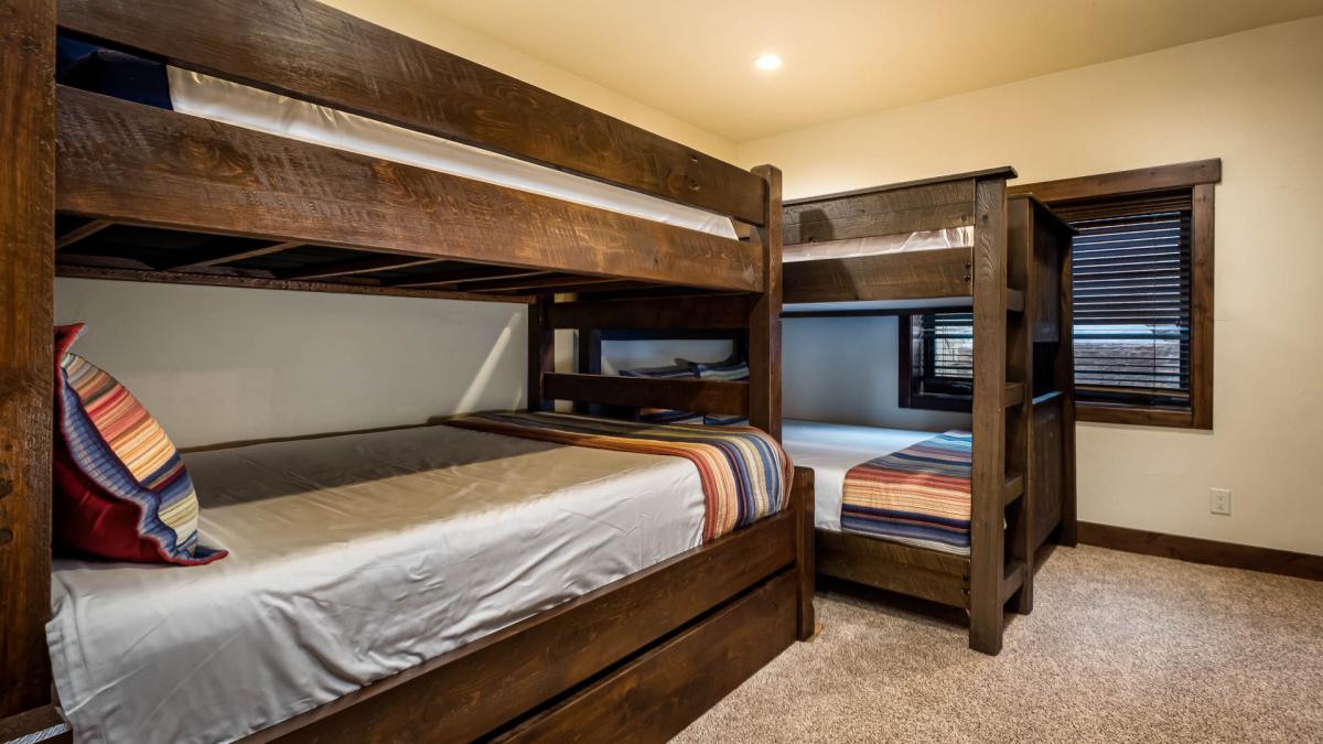 •  Bedroom 4: Queen bunk beds, full bunk beds, private bathroom with shower and bathtub