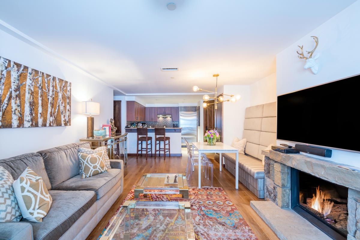 The heart of this condo is a gas fireplace located in the elegant and stylish living area. This space is perfect for warming up after a day on the slopes while enjoying each other's company. A flat screen television and sleeper sofa. Guests are able to access a private balcony through glass doors.