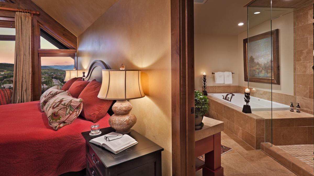 There are four bedrooms in this grand residence, each master bedroom offers a gas fireplace and the master bath features a steam shower and Jacuzzi tub. Each of the four bedrooms also feature vaulted ceilings and their own bathroom. The master bedroom with King bed has an oversized bathroom. The Guest Master also offers a King bed. The third bedroom offers two full beds and the fourth offers two sets of bunks with twin beds over queen beds.