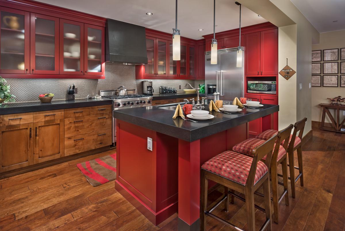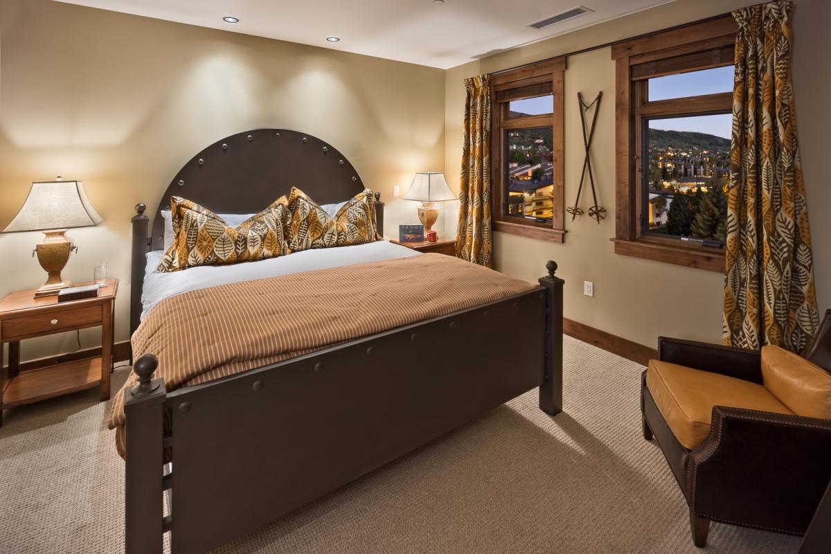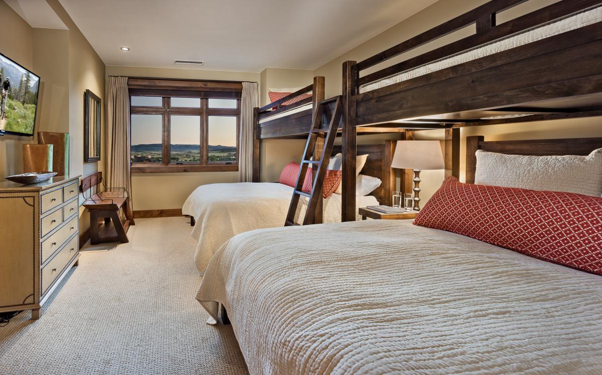One Steamboat Place residences feature rich colors, natural textures, and sumptuous fabrics throughout. Each master bedroom offers a gas fireplace. The main master bath features a steam shower and Jacuzzi tub. In this residence 2 bedrooms offer a King bed with private bath. The third bedroom has two full beds, and the fourth bedroom offers an impressive bunk set up with two queens and two twin beds, all with private bathrooms.