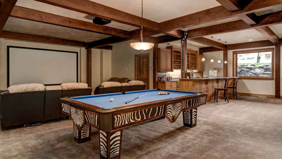 The lower level of Rocking Chair Lodge is specifically built for entertaining. A media room hosts a movie screen and is outfited with reclinign theater seats. A full wet bar with beverage refrigerator/freezer, pool table, and fireplace are all present. Next door, you'll find ping-pong and foosball with a 14 foot climbing wall in the play room.