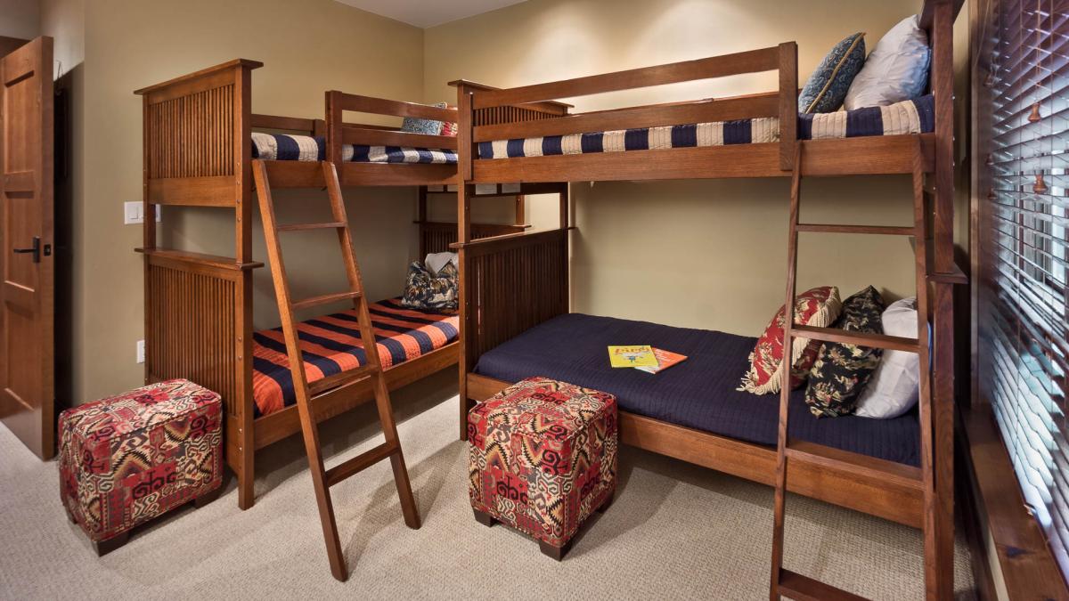 All One Steamboat Place residences feature rich colors, natural textures, and sumptuous fabrics throughout. The master bedroom offers a gas fireplace and large LCD TV. The main master bath features a steam shower and Jacuzzi tub. In this residence the second bedroom also offers a King bed with private bath. The third bedroom offers two sets of twin bunk beds, with a private bathroom right next door.