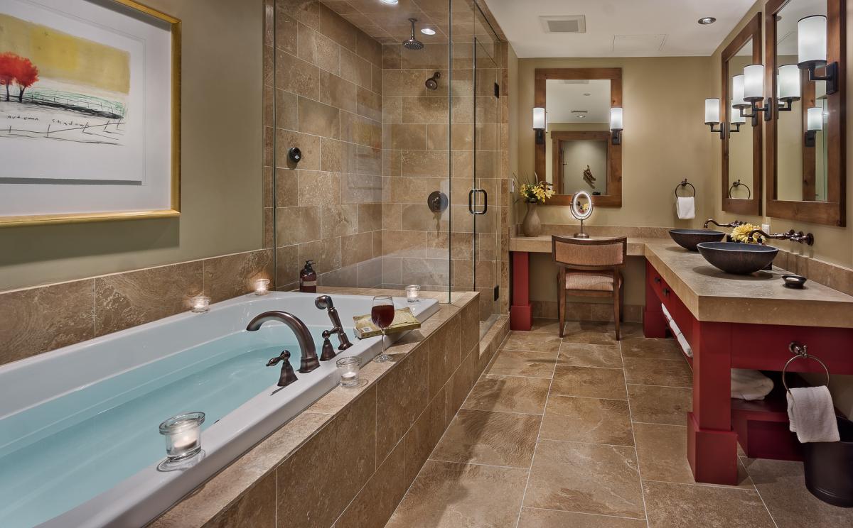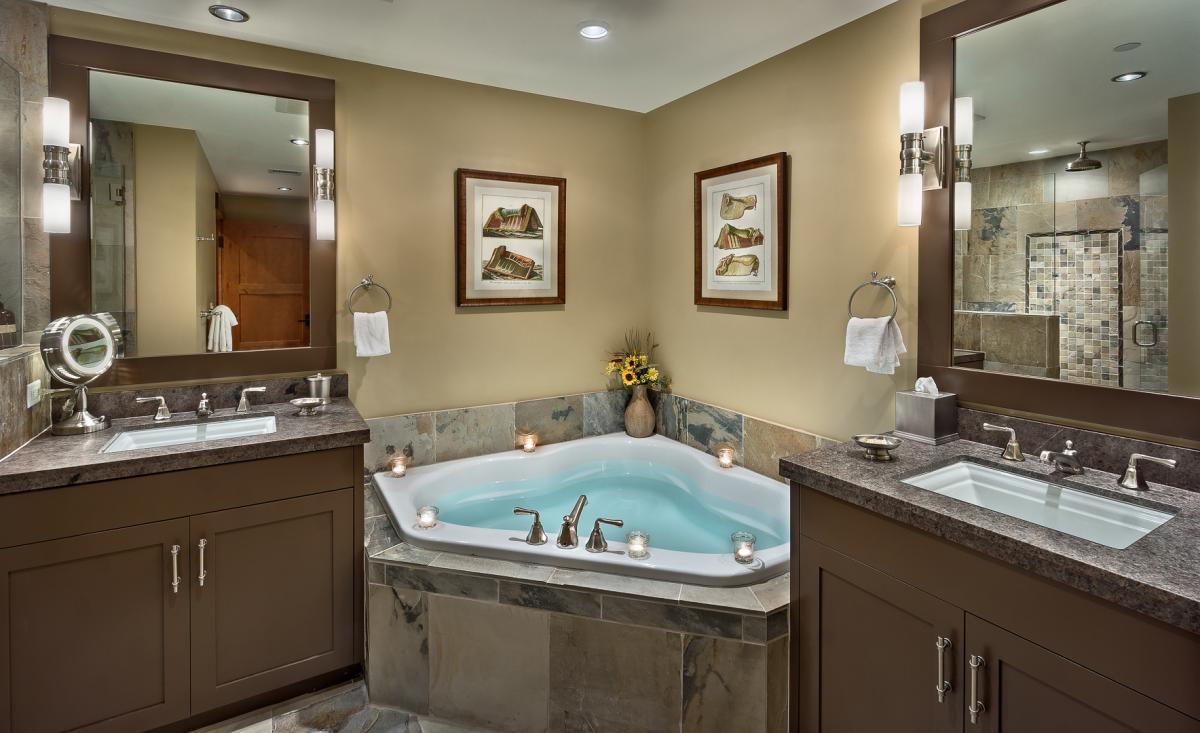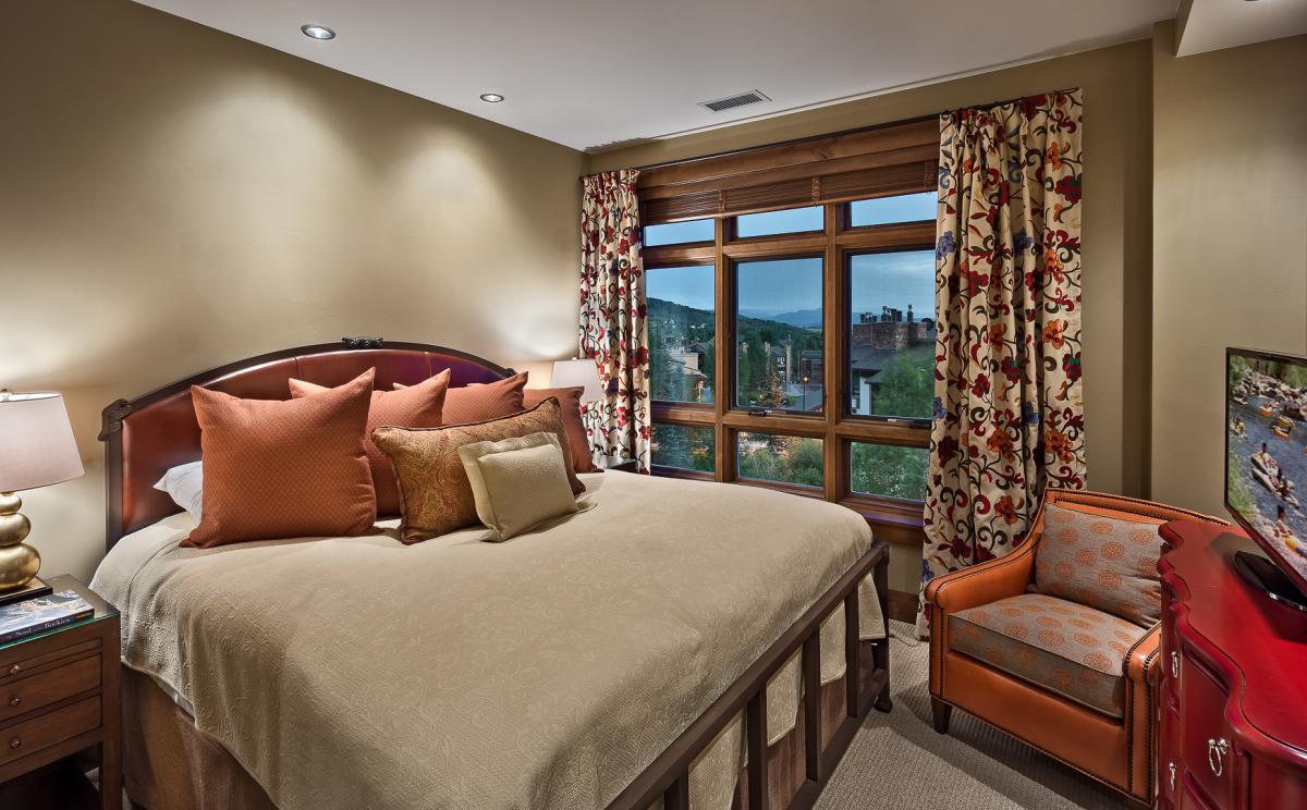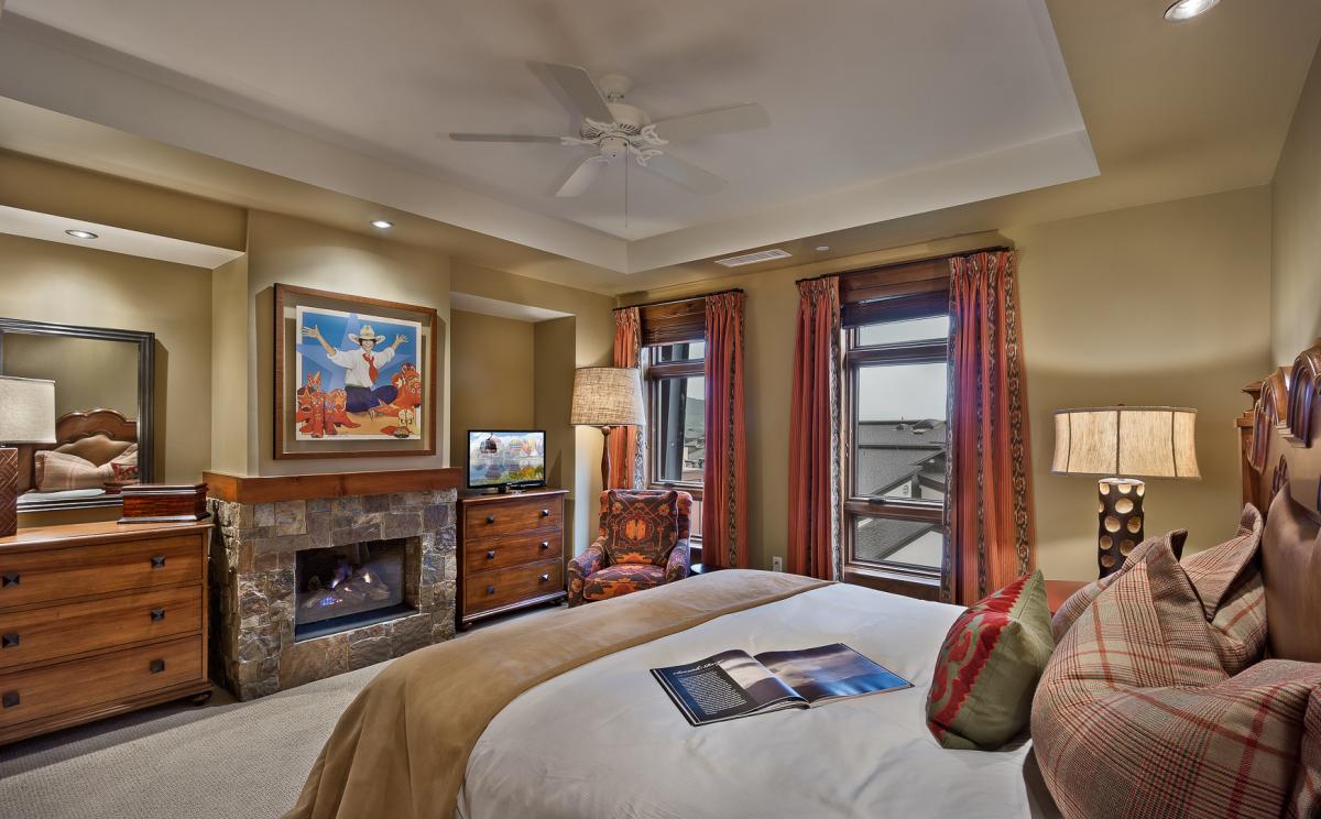 All One Steamboat Place residences feature rich colors, natural textures, and sumptuous fabrics throughout the home. Each master bedroom offers a gas fireplace. The main master bath features a steam shower and Jacuzzi tub and bidet. In this residence 3 bedrooms offer a King bed with private bath, and the fourth offers a Queen bed and bunks with two full beds, all with a private bathroom - great for kids.