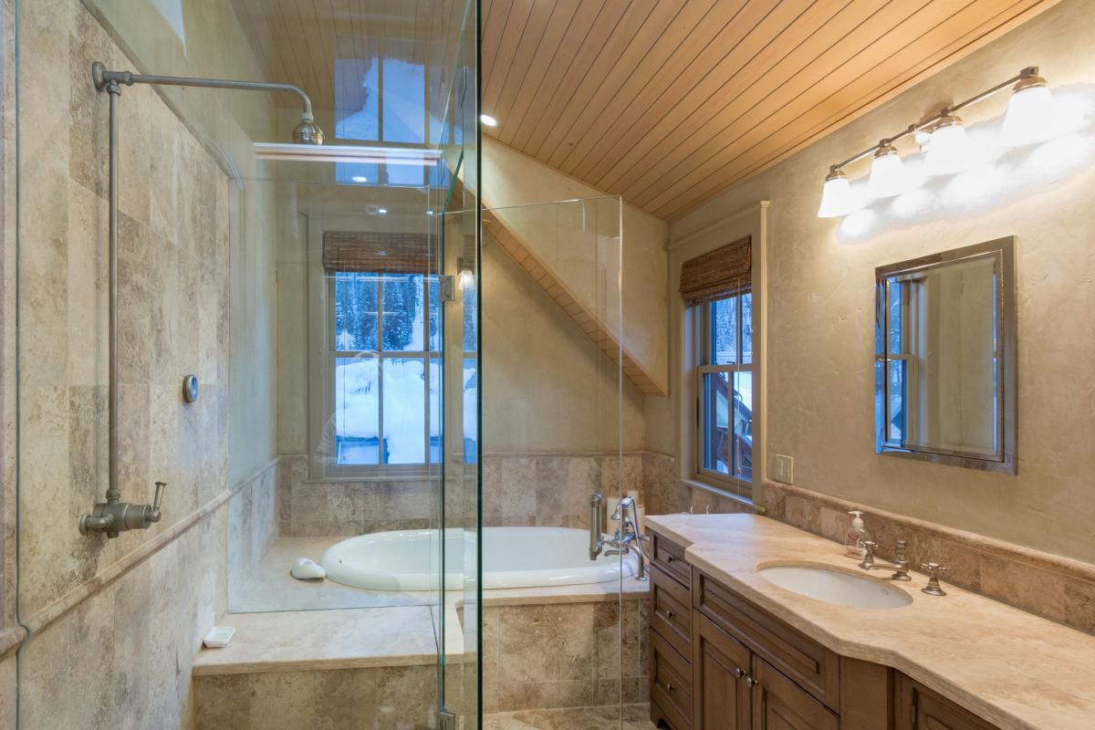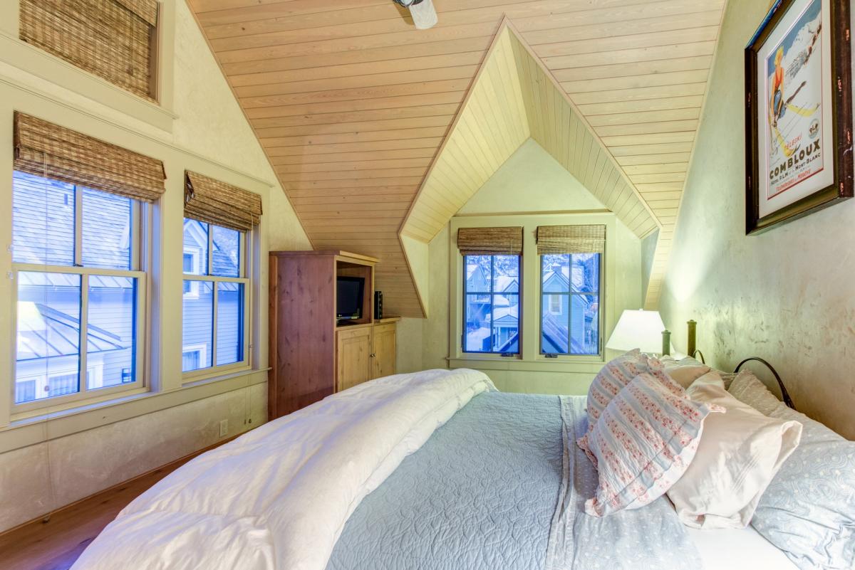 Guest 2 is also located on the upper level and features vaulted ceilings with views of Ajax Peak. This room is complete with a large television, window seat and en suite bathroom with steam shower.