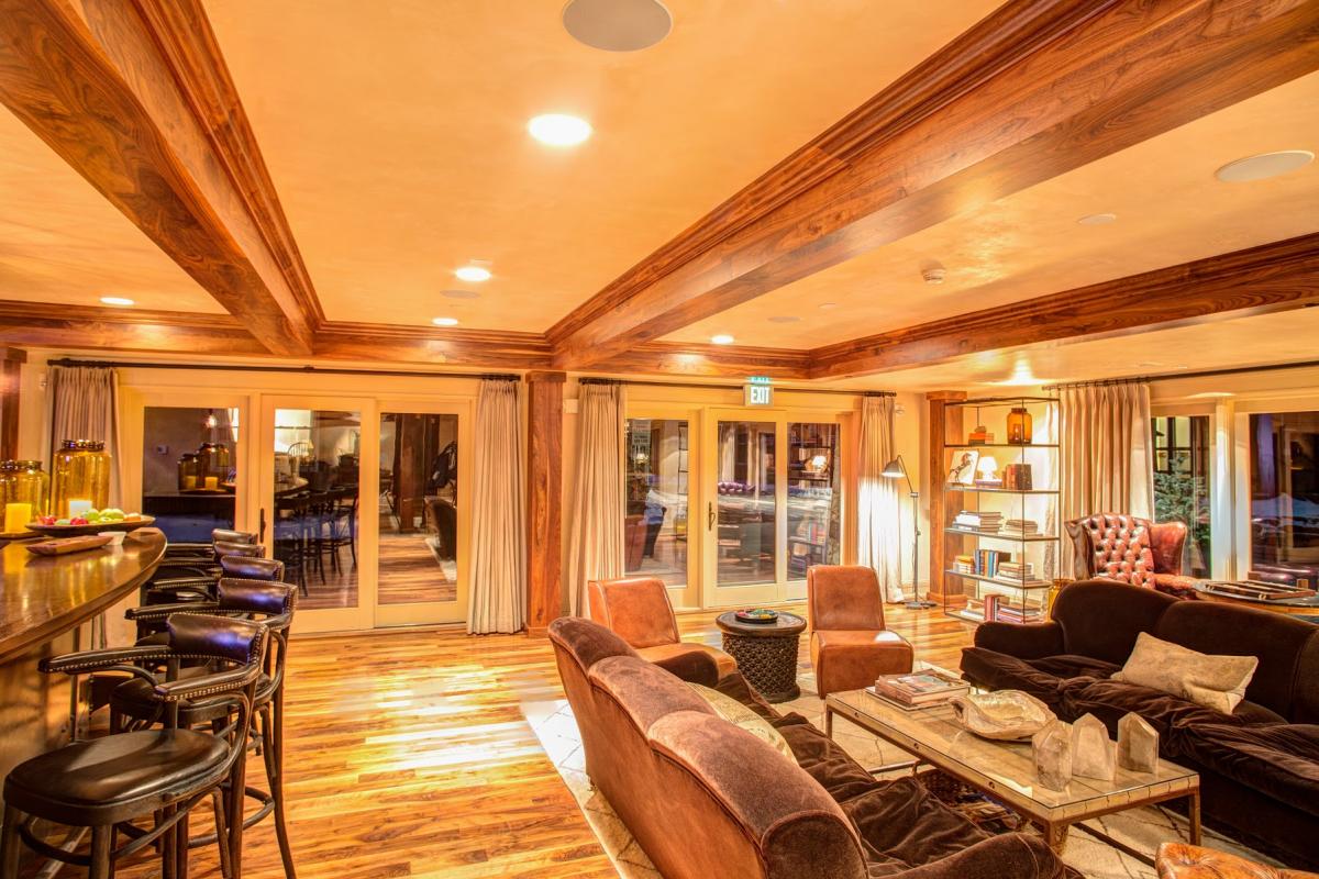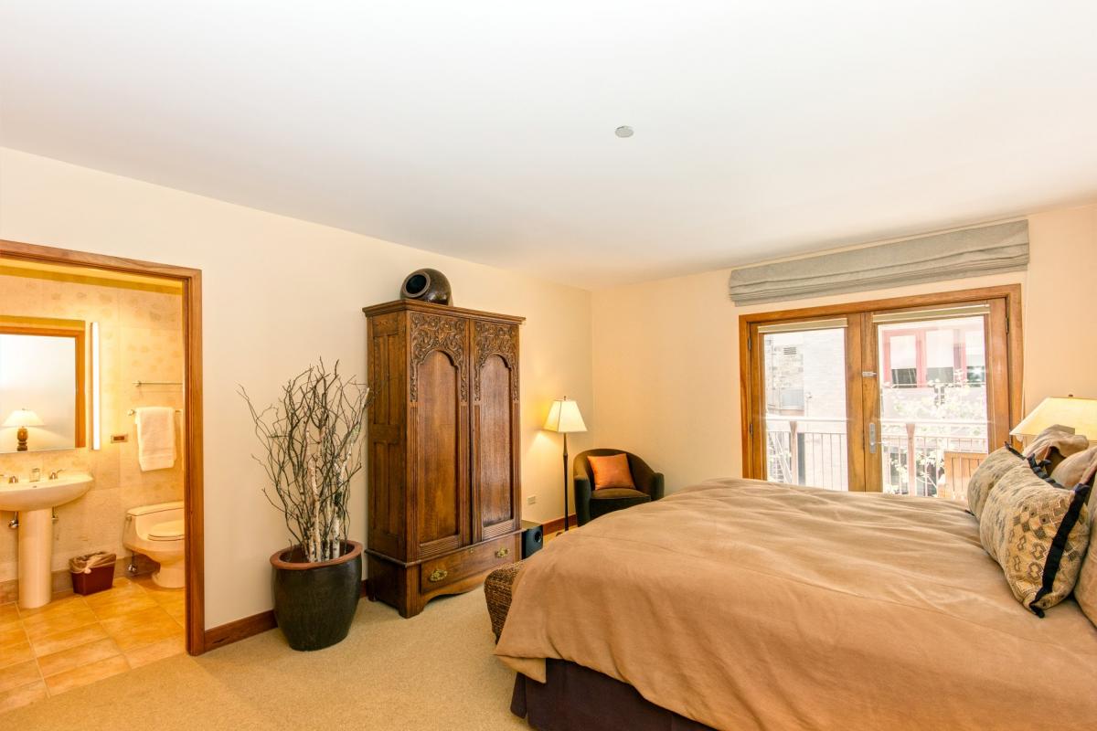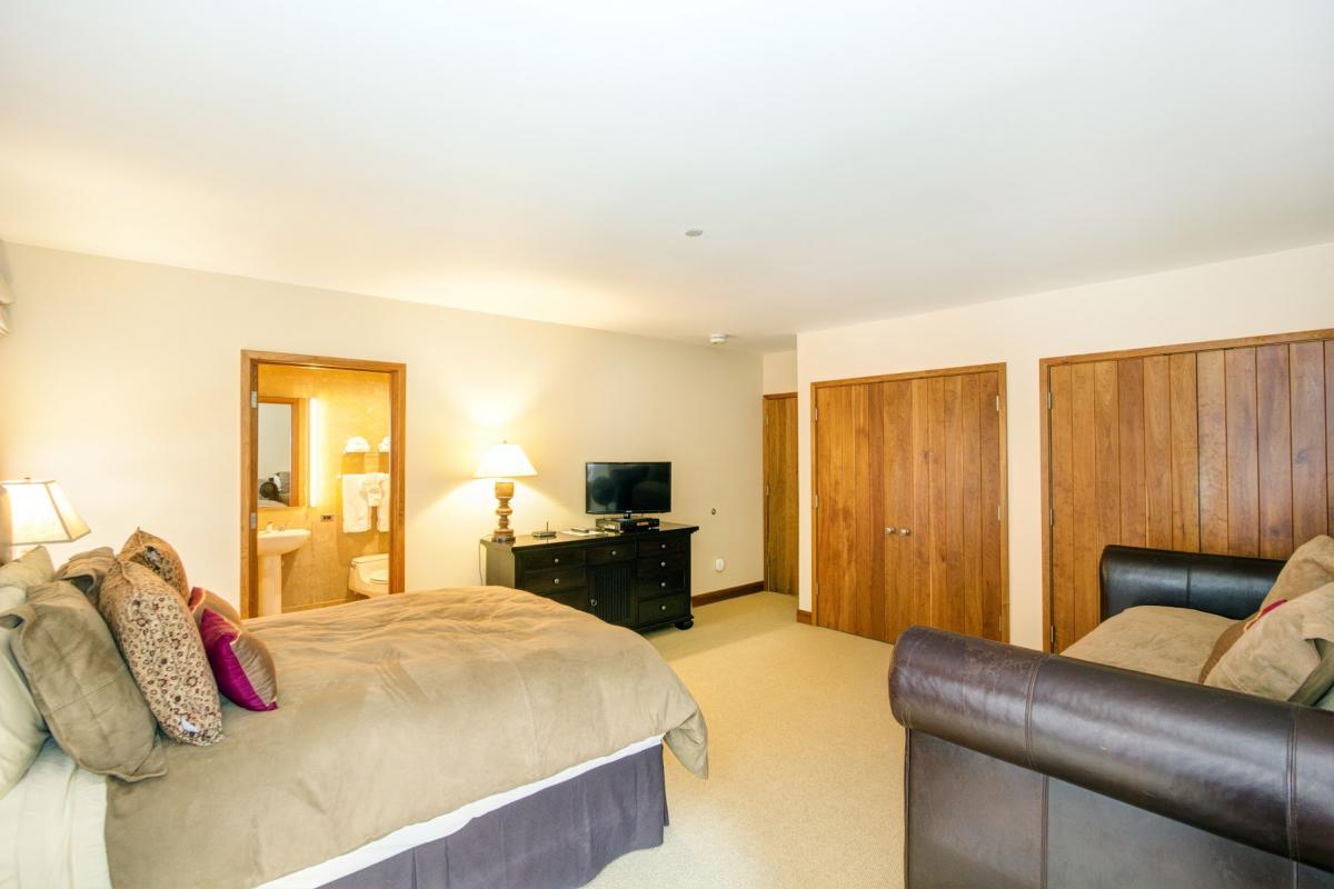 The second entrance to the property opens to a series of three bedrooms. All bedrooms share one balcony, which overlooks the property’s fire pit and common area. The queen guest suite is spacious and can sleep up to four guests in a queen size bed and an additional twin bed with trundle underneath. The queen guest suite includes a flat screen TV/DVD player, as well as an en suite bathroom with a jetted tub/shower combination. Continue down the hall to the king guest suite, with another flat screen TV/DVD as well as an en suite bathroom with a jetted tub and shower. At the end of the hallway, find the king master suite; a beautifully appointed room with a king size bed, small sitting area and flat screen TV/DVD. The en suite master bathroom includes a double vanity, jetted tub and a separate steam shower… perfect for après ski relaxation.