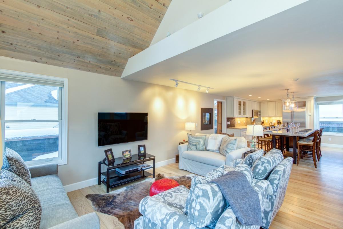 On the upper level of the home, there is a chic master suite with an inviting king-sized bed, matching armchairs, plenty of wardrobe space and a flat-screen TV. The master bathroom has a steam shower and double sinks. There is also a small private deck off the master bathroom.