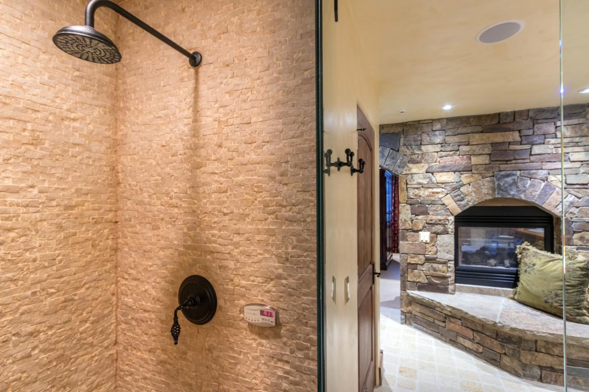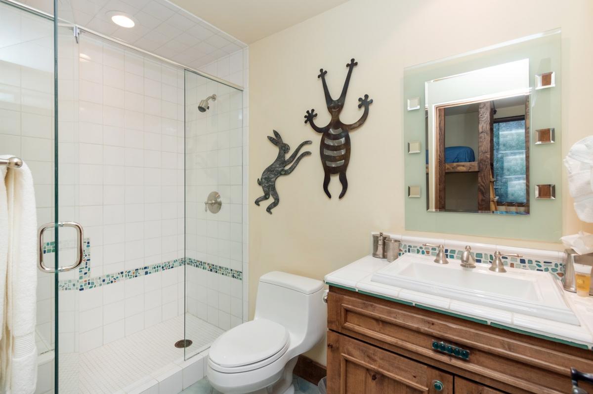 There are two more bedrooms downstairs, each with their own bathroom and TV. One has a queen bed; the bathroom has a steam shower. The other bedroom has bunks, with two fulls and a twin. This level leads out to the hallway where the ski locker is located.