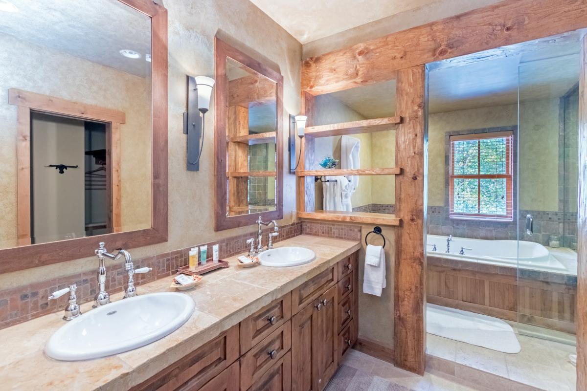 The other two bedrooms are downstairs and both open up onto a den with another large flat-screen TV. One bedroom has bunk beds, with a full on the bottom and a twin on top. The other bedroom has two queen beds. Both bedrooms have their own en suite bathrooms. The den opens up to a patio with a private hot tub.