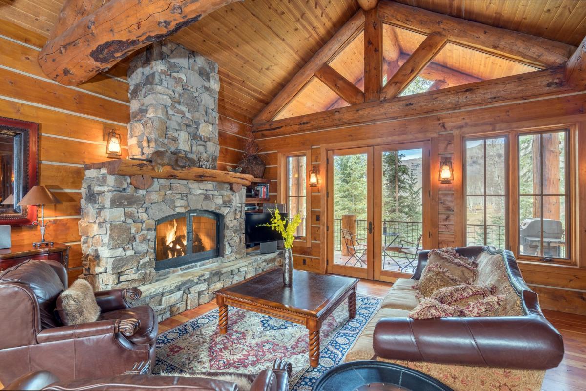 Mountain Creek Lodge is home to a stone gas fireplace featuring carved mantle. Guests are welcome to entertain in the comfort of cozy seating areas. Large glass doors open from the Great Room onto a private patio with bistro seating.