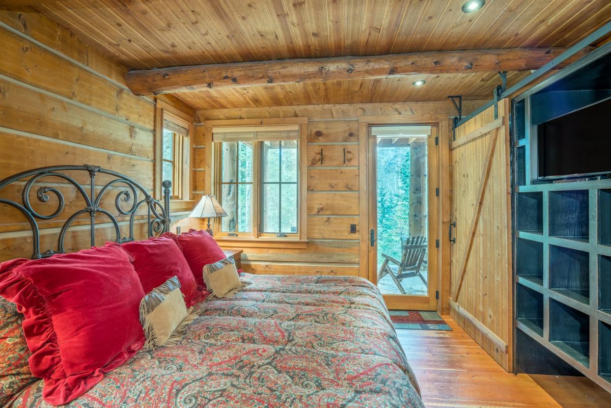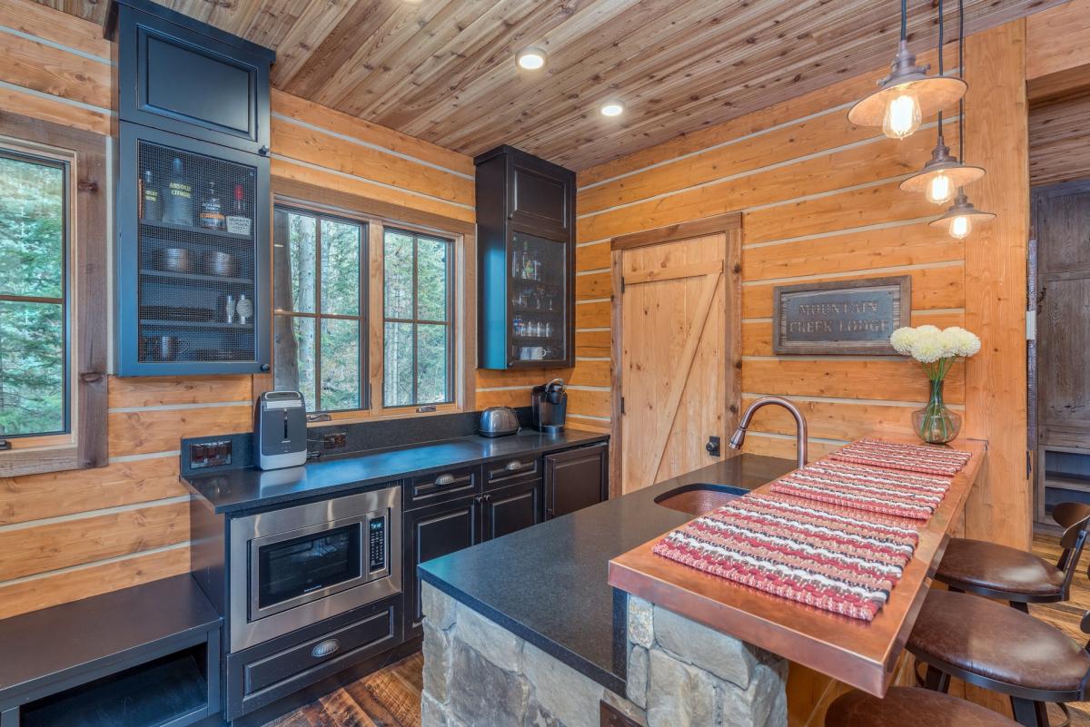 A gourmet kitchen and formal dining with wet bar lie just beyon the great room. Chefs will appreciate the fully equipped kitchen featuring stainless steel Wolf oven and Keurig coffee maker. Guests at Mountain Creek Lodge can sit at the copper bar (seating for two) or formal dining area (seating for four). The entire area is complete with windows to allow the sun's rays into the living space.