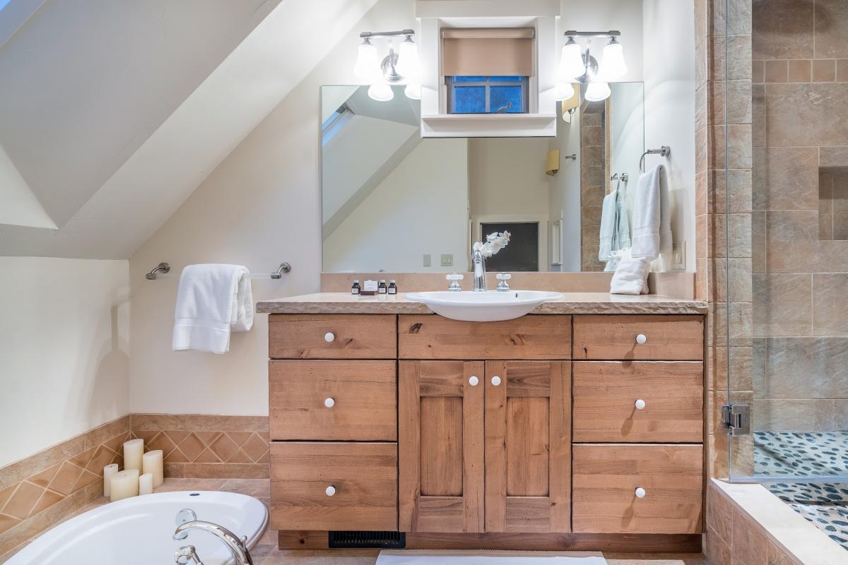 Before reaching the Master Suite, guests pass the door to this property's attached garage, giving space for any vehicle that may be used while exploring Telluride and its surroundings. The entire top floor houses the Master Suite with vaulted wood ceilings, a skylight, queen size bed, built-in work desk, walk-in closet, private balcony and en suite bathroom. The Master bathroom is a true space for luxury and relaxation with an exceptional steam shower with overhead waterfall shower head, two seats and pebbled flooring, along with stone counter top sink and sunken jetted soaking tub.