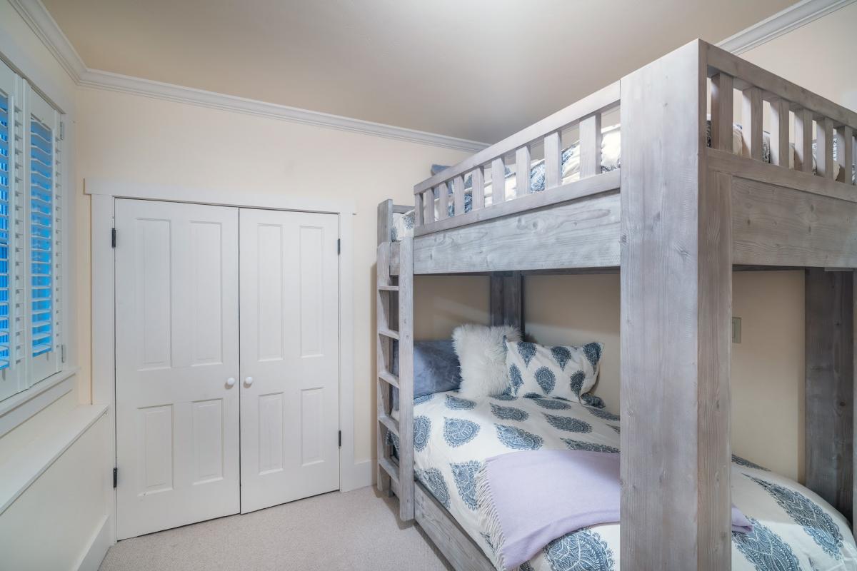 Serving this space and the full guest bedroom that follows is a lovely guest bath, up just a few steps and off to the left with painted brick tile throughout complemented by white shiplap, pedestal sink and shower/ tub combination. Beyond this bathroom is an additional guest room, with vaulted ceiling, hard wood floors and similar white painted shiplap throughout. This unique room offers a raised full bed and small loft area above.