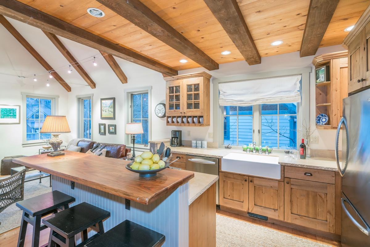 The upper level of the house can be accessed just off this guest room past the laundry room with full washer and dryer and utility sink, or off the stairs from the main entrance. This grand room with vaulted ceiling's and exposed wooden beams, is filled with sunlight from the plethora of windows that surround and large deck just off the room’s south side. The deck is furnished with a round table and seating for four with two additional wicker chairs, and magnificent views of the Box Canyon. The living area is furnished with a flat screen TV, leather couch and two leather chairs with matching ottomans all centered around an iron coffee table. In the corner of the room, the gas fireplace and small window bench make this room perfect to sit and read or enjoy a board game with the family. Flowing into the kitchen with beautiful stone countertops, wood custom cabinets, stainless steel appliances and and breakfast bar for three, this space was designed for family and friends to catch up and make memories together. The dining table with built in bench seat and chairs can seat up to six while overlooking the master chef in the kitchen. An additional pantry with sink, microwave, glassware and additional appliances can be found neighboring this grand space.