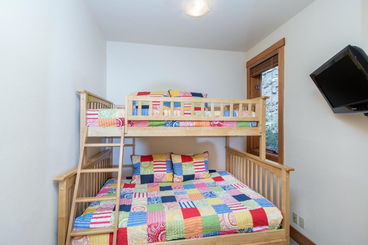 • Bedroom 2: Bunk bed (one full bed and one twin bed), twin trundle bed, TV