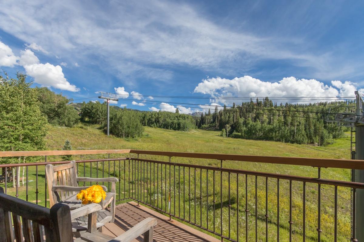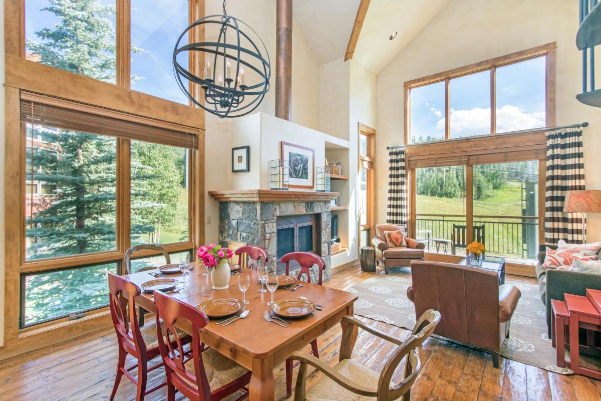Unit 1102: You can see everything from here: the Meadows ski run plus the awe-inspiring surrounding mountains. This sun-filled upstairs unit has two bedrooms on the main floor. The master bedroom has a king bed with en suite bath and a flat screen TV. The guest bedroom has two twin beds that can be made into a king. The loft overlooks the great room and has two sets of bunk beds, with fulls on the bottom and twins on top. The great room has a dining table that seats eight, a gas fireplace, flat-screen TV with DVD player, and a CD stereo. It doesn't get much better than cooking on the gas grill on your private deck while watching the skiers go by or taking in the spectacular scenery.
