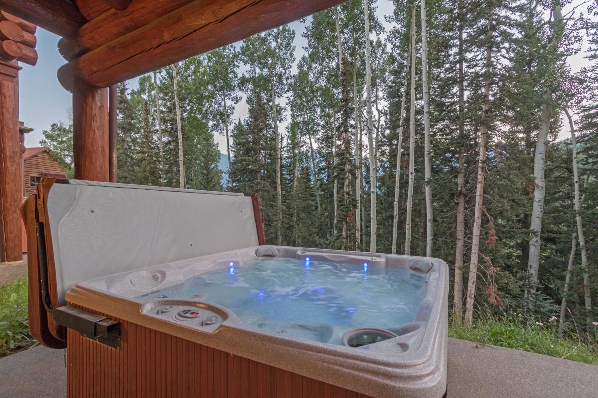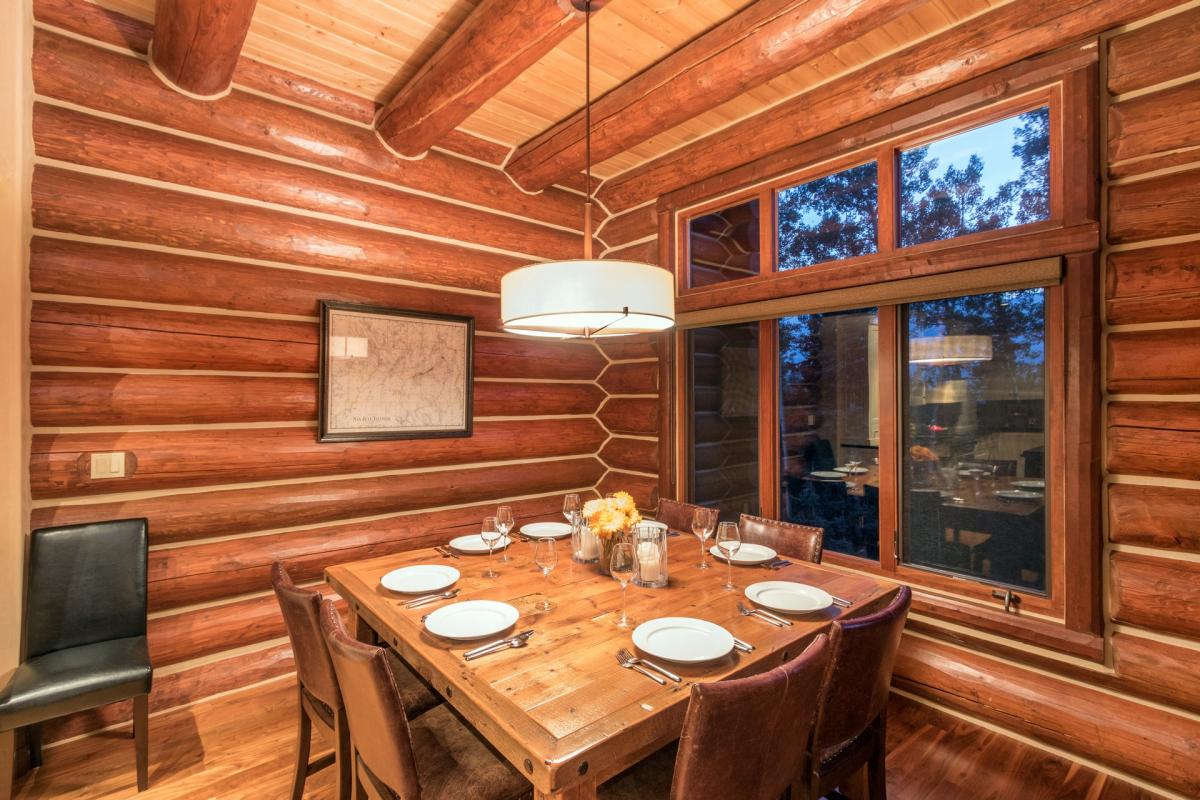 Walk under the traditional log eve through the impressive wood and glass doorway to find the natural light from the Colorado bluebird sky to follow behind. A coat rack made from vintage wooden skis sets the tone for this vacation destination. A guest bath with white stone countertops can be found just beside the door, in perfect convenience. The black slate floor of the foyer leads onto the hardwood floor of the open dining, kitchen and living space with high vaulted ceilings, exposed wooden beam walls and floor to ceiling picture windows. The door to the garage can be found to the right just before entering the living area. Centered around a large stone wall is a gas fireplace with leather sofa, three chairs, and two cow hide ottomans giving comfort and elegant to the space. French doors lead onto the deck with gas grill and seating to gaze upon the beautiful trees and mountains that surround. Beside is the kitchen with granite countertops, Viking stainless steel appliances, custom cabinets and a breakfast bar for four, making the perfect space for cooking and socializing. Adjacent is a dining table for eight surrounded by leather chairs and a wooden bench all overlooking the beautiful San Sofia Ridgeline.